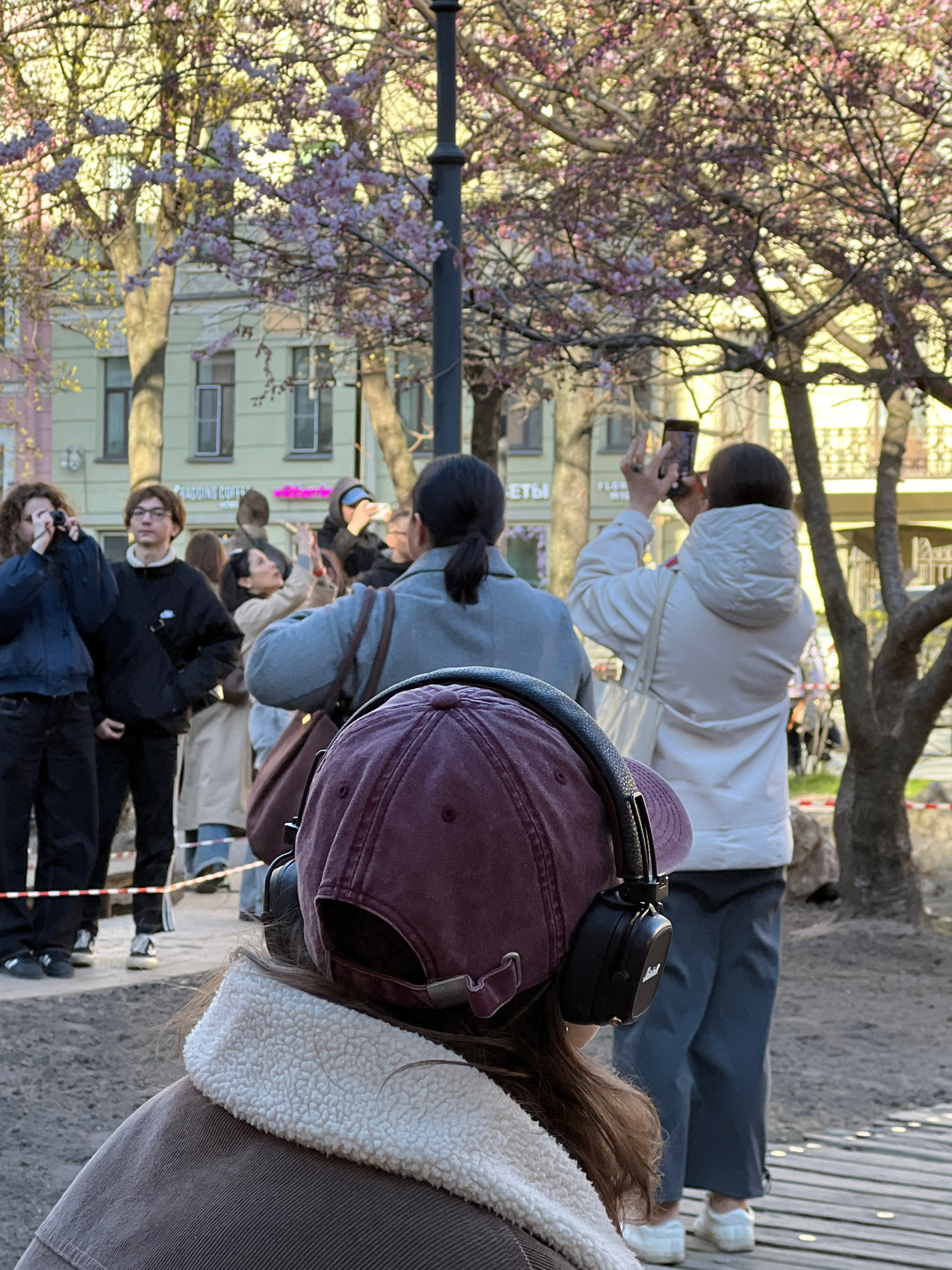 The image depicts an outdoor urban scene in Saint Petersburg, Russia, during what appears to be spring, with a crowd gathered around blossoming trees. In the immediate foreground, the back of a person's head is visible, wearing a maroon baseball cap with black over-ear headphones resting on it, and a jacket with a cream-colored sherpa lining. Behind this individual, numerous people, mostly young adults, are congregated. Many are actively engaged in taking photos with their smartphones, suggesting they are capturing the beauty of the flowering trees. A person in a white hooded jacket is prominently seen holding up a phone to photograph the scene. Other individuals are standing, observing the surroundings. The central natural element is a large tree adorned with delicate light pink or purple blossoms, particularly noticeable on the left side of the frame. Its branches extend across the sky, indicating a vibrant springtime display. In the background, urban architecture is visible, including buildings with multiple windows. One building clearly shows faint Cyrillic text, including "BAKAS COFFEE" and "ЦВЕТЫ" (meaning 'Flowers'), confirming the Russian context. A dark street lamp post is also visible in the mid-ground. The scene is bathed in bright, natural light, suggesting a pleasant daytime setting. The overall activity conveys a sense of appreciation for nature within an urban environment, as people gather to admire and document the seasonal bloom. | Open Wire