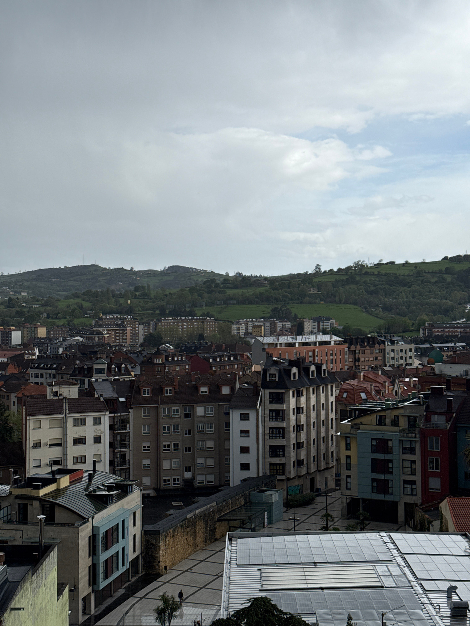 The image shows a cityscape with buildings nestled against a green hillside. The sky is overcast with some breaks in the clouds. The buildings vary in height and color, with some having red tile roofs…read more