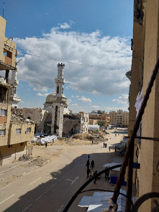 The image depicts a devastated urban landscape in Khan Yunis, Palestinian Territory, under a partly cloudy blue sky. A prominent white mosque with a single, largely intact minaret stands centrally, it…read more