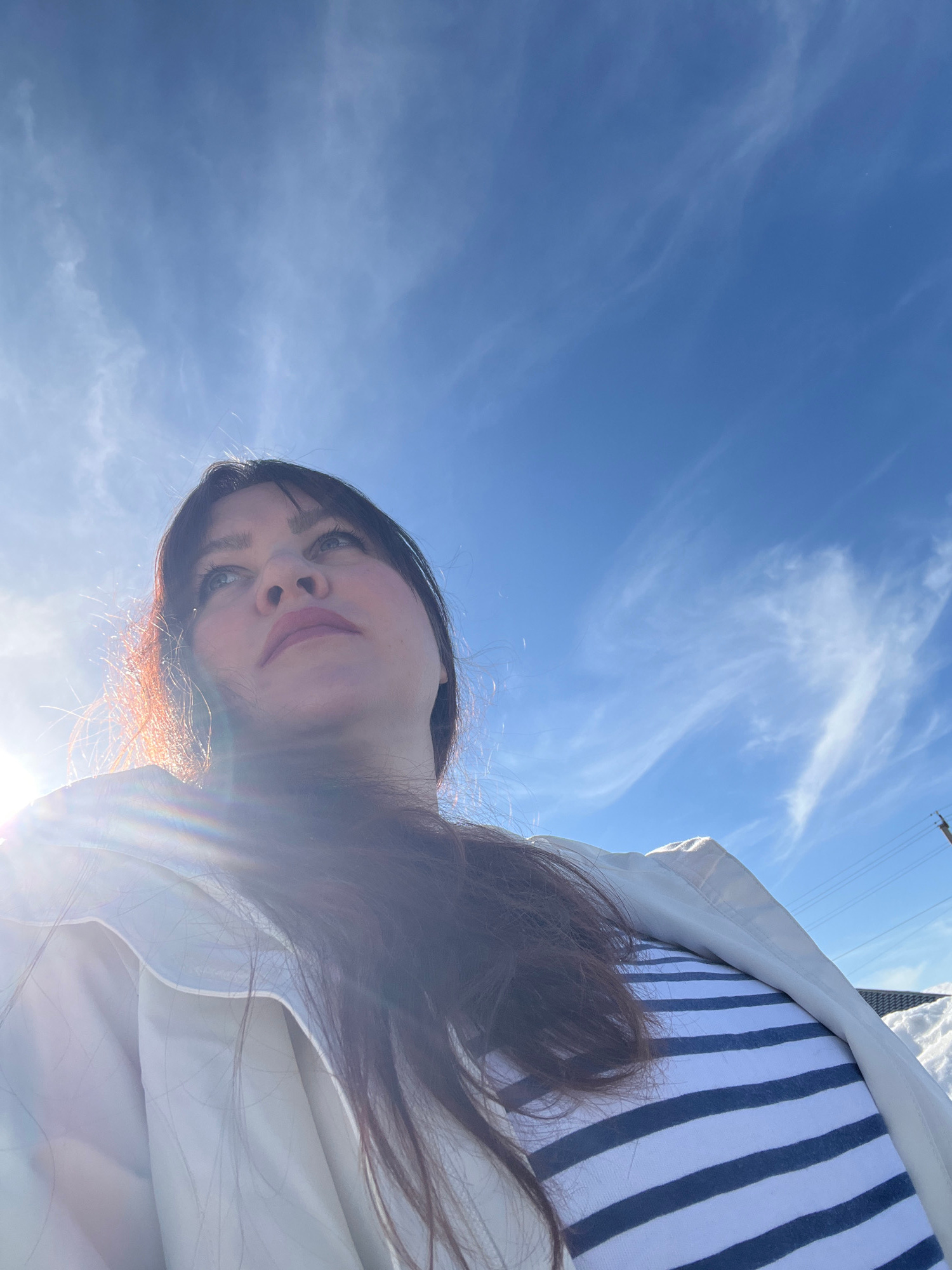 A low-angle upward photograph depicts a female individual outdoors in Noviy, Russia, on a bright, sunny day. The subject, positioned centrally, has dark hair with sun-highlighted reddish tones and is…read more