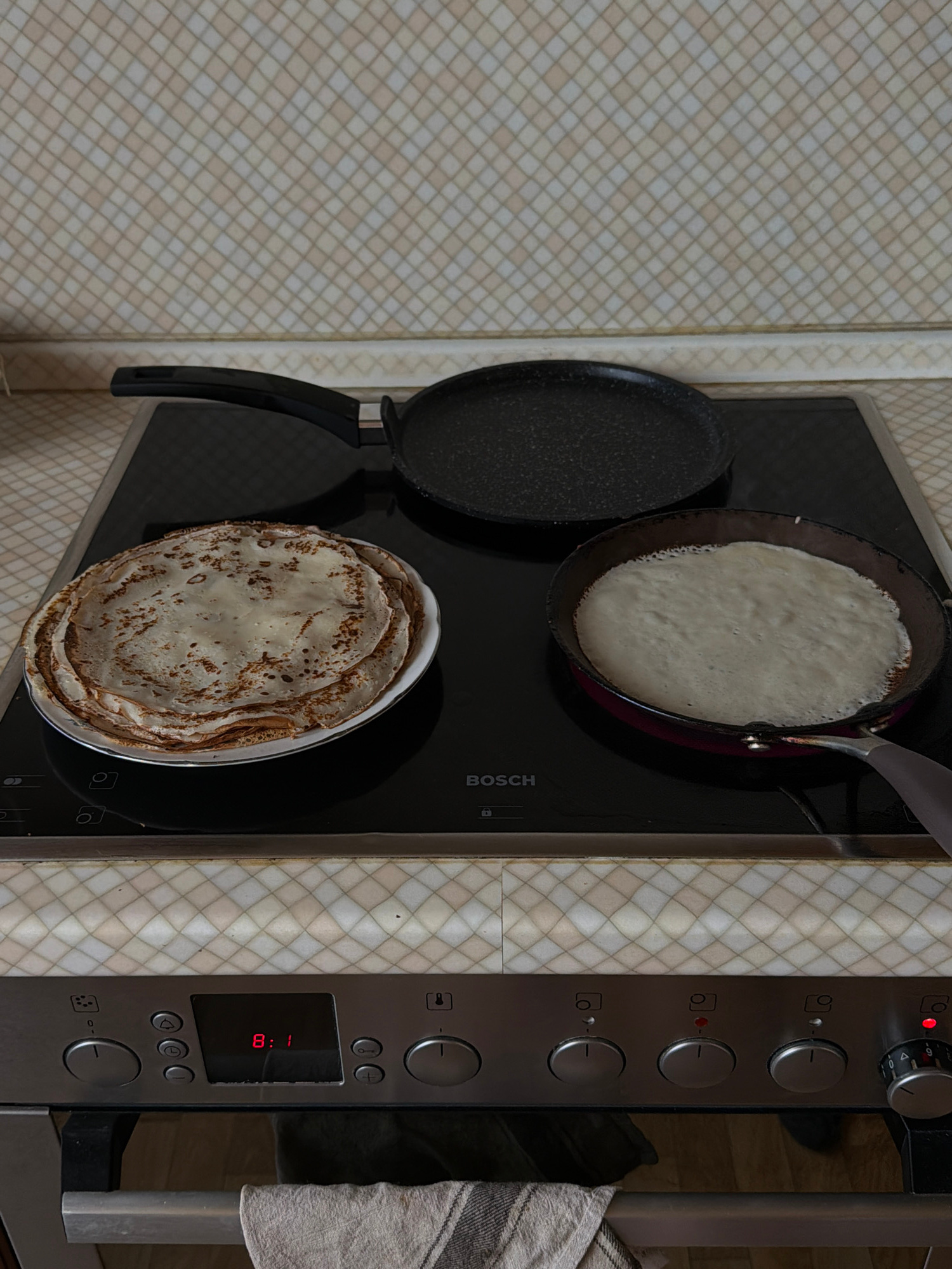 The image shows a kitchen scene with a focus on pancake preparation on a black Bosch induction cooktop. Two frying pans, one with batter cooking and the other empty, are on the stovetop alongside a wh…read more