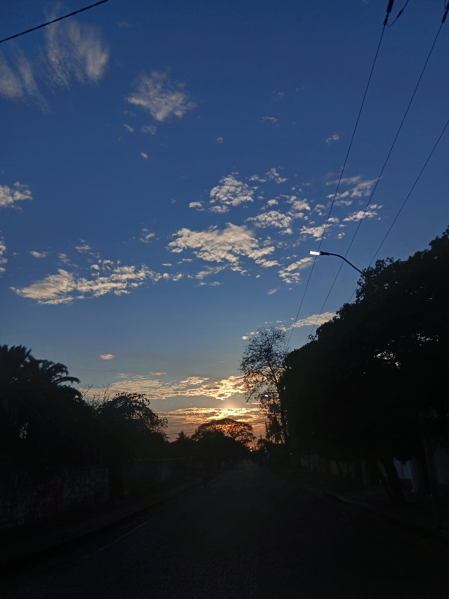 The image shows a view in Juan Griego, Venezuela, at either sunrise or sunset. The sky is blue with scattered white clouds. A streetlamp is visible, hanging from wires extending across the frame. The…read more