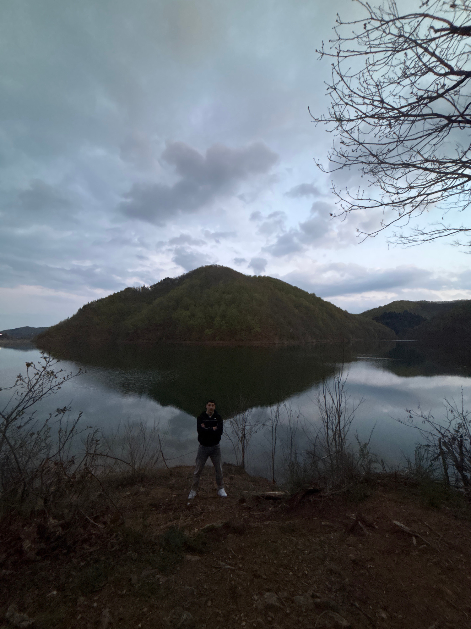 The main image, when viewed upright, depicts a serene natural landscape near Alamovtsi, Bulgaria. A male figure stands on a dark, earthy bank to the right of a calm body of water, which perfectly refl…read more