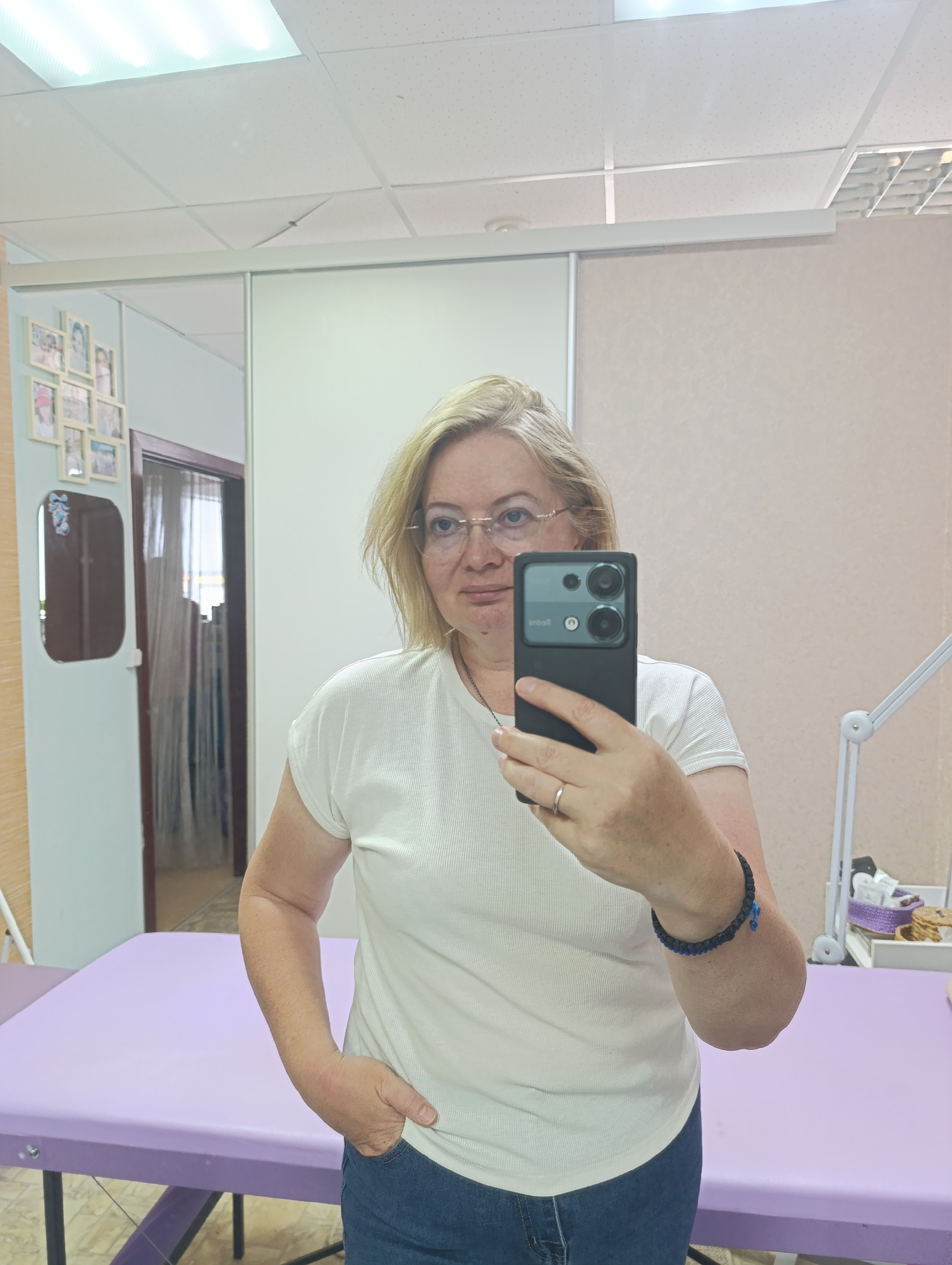 A blonde woman, appearing to be in her 40s or 50s and wearing glasses, a white ribbed t-shirt, and blue jeans, is depicted taking a mirror selfie indoors in Chaikovsky, Russia. She holds a black smartβ¦read more