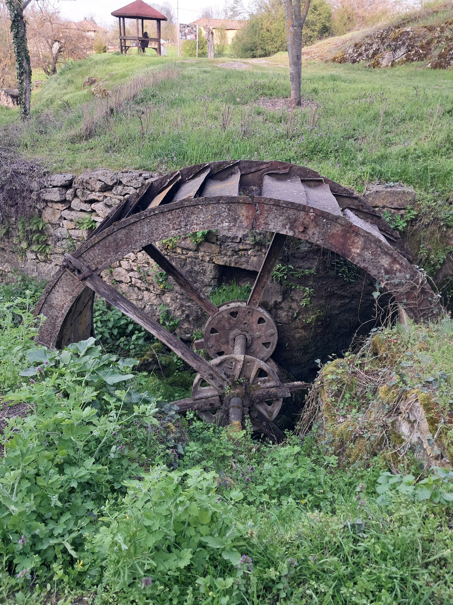An old, weathered water wheel is the central focus, partially obscured by lush green vegetation. The wheel's metal components are rusted and the wooden supports appear aged. Behind the wheel, a stone…read more