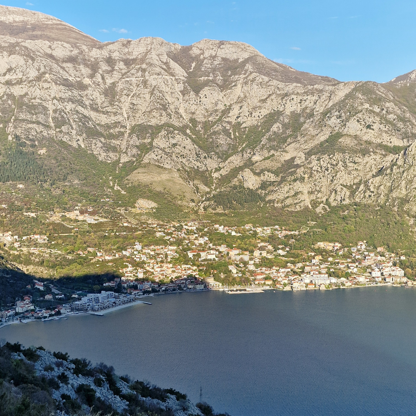 The image depicts an aerial view of Strp, Montenegro, located on the coast of the Bay of Kotor. A steep, mountainous terrain dominates the left side of the frame, characterized by light-colored rock f…read more