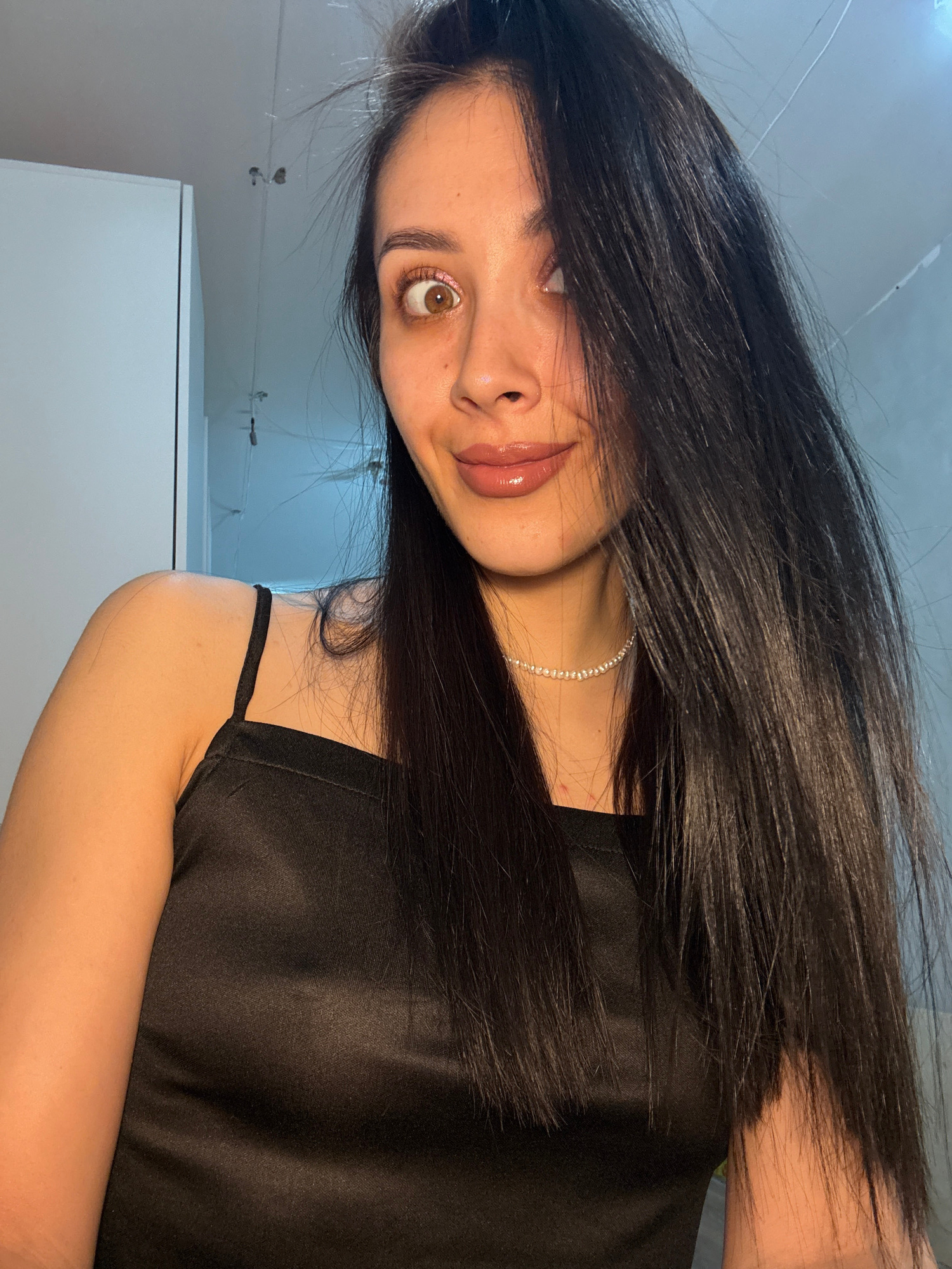 A young woman is captured in a close-up, casual portrait, likely a selfie, in Votkinsk, Russia. She has long, straight, dark hair that falls loosely around her, partially obscuring her face and extend…read more