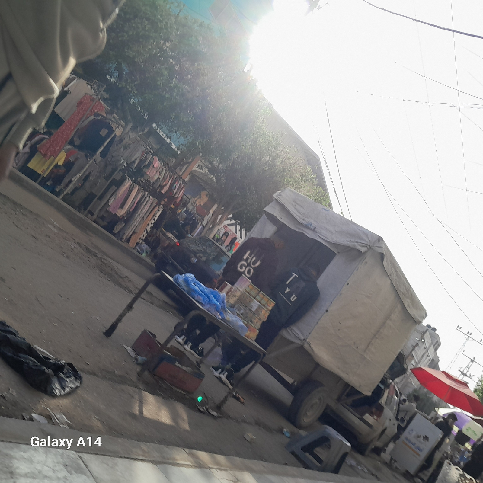 The image depicts an outdoor market scene in Deir el-Balah, Palestinian Territory. Clothing racks line the street to the left. A makeshift stand, possibly a cart, is covered with a tarpaulin. Two indi…read more