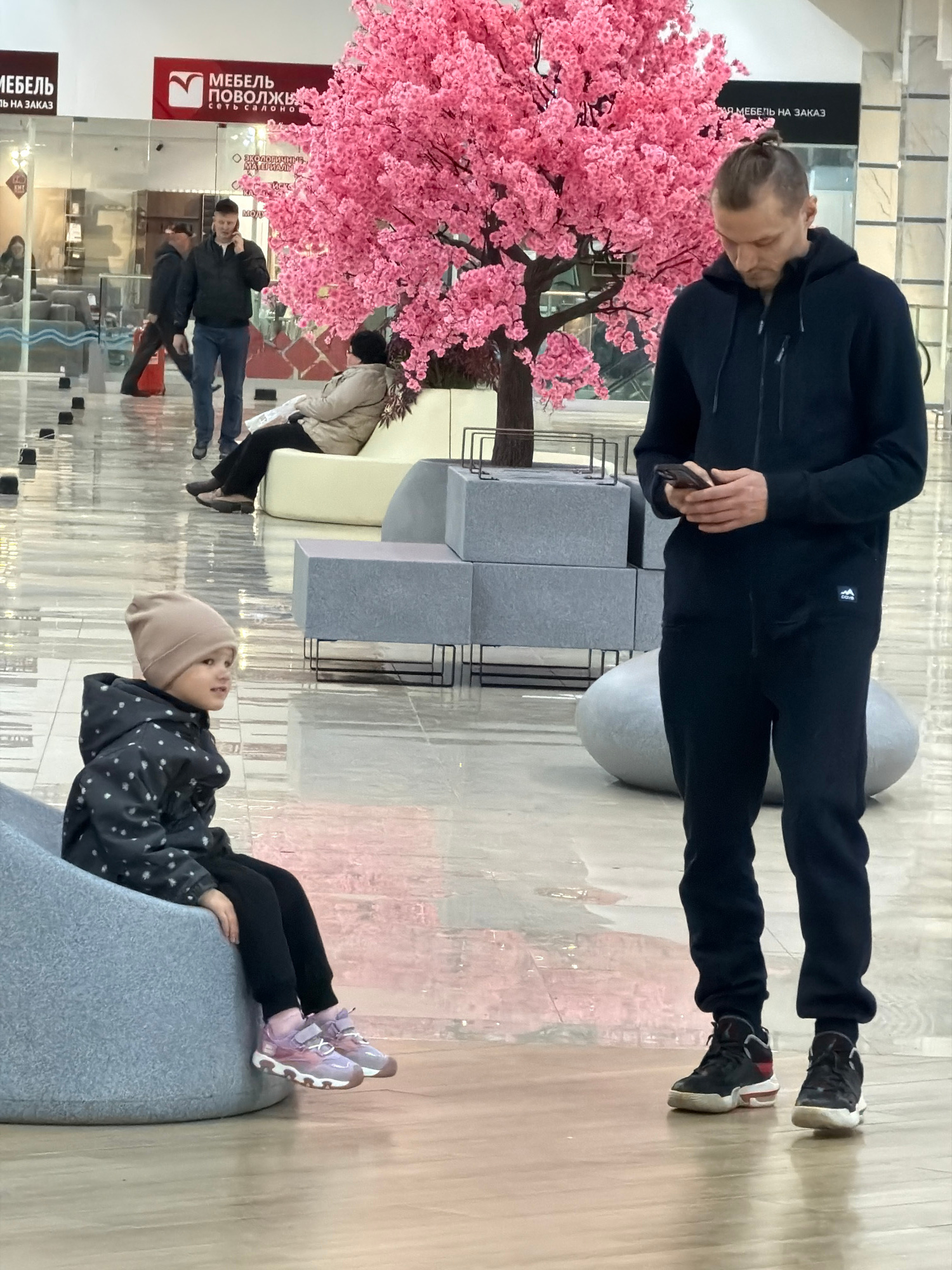 The image shows an indoor scene, likely within a commercial space such as a shopping mall, in Izhevsk, Russia. A man in a black tracksuit is standing upright in the background and is looking at his ph…read more