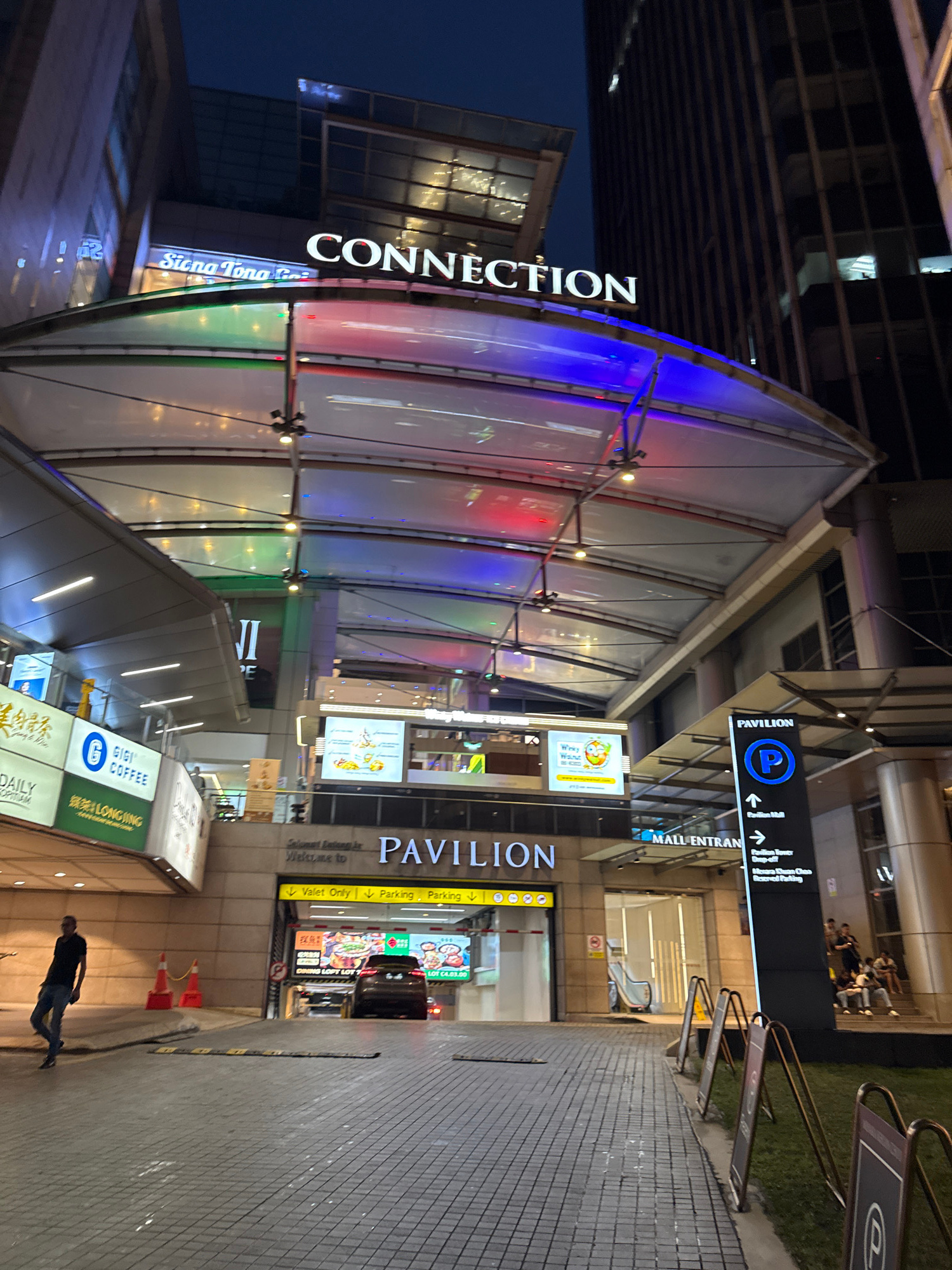 This is a nighttime street scene in Kuala Lumpur, Malaysia. The view is of the entrance to Pavilion KL, a shopping mall, from a pedestrian perspective. The "CONNECTION" sign is visible, as is the mall…read more