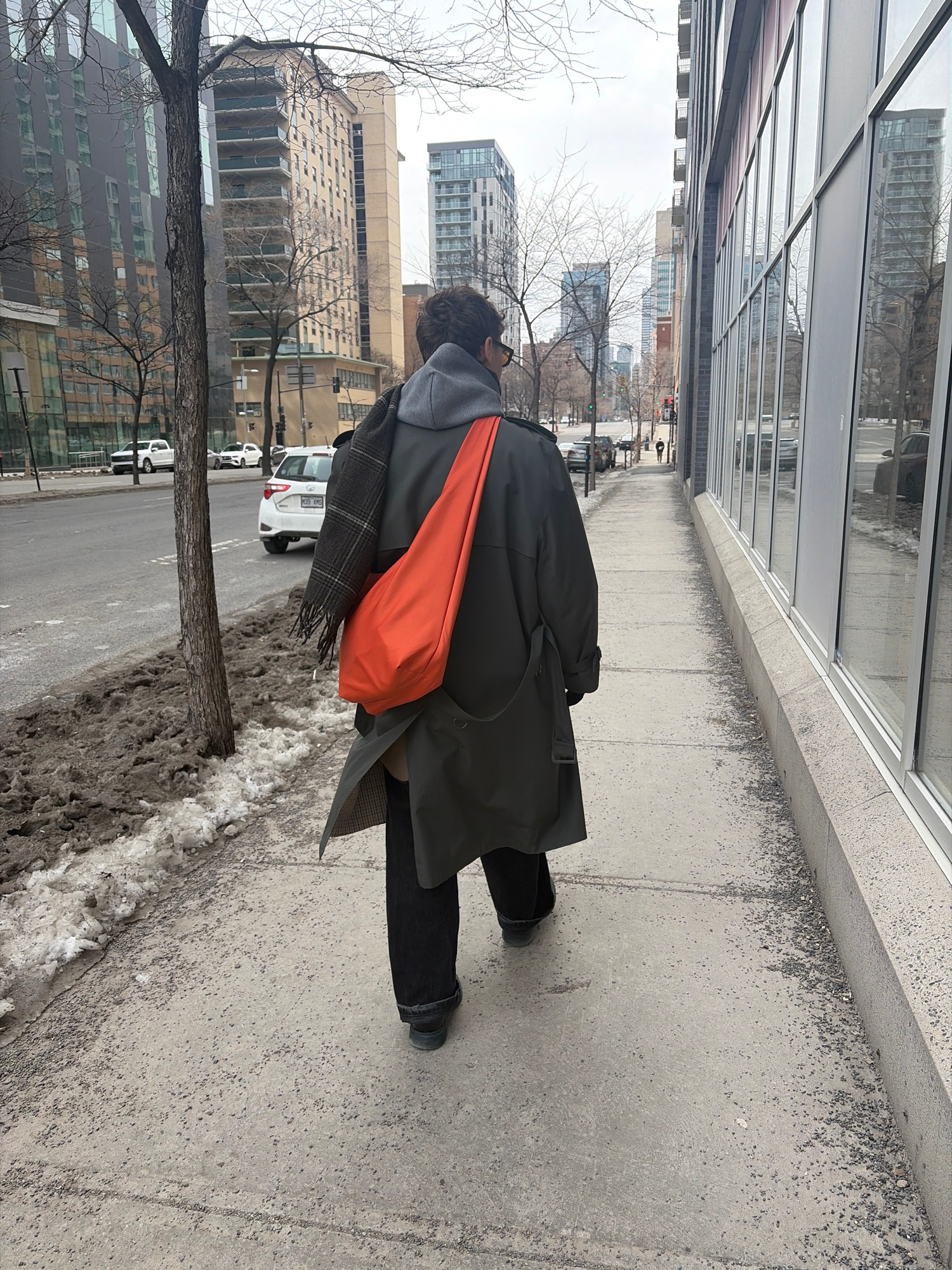 A person is walking on a sidewalk in Montreal, Canada. The individual is wearing a dark coat, grey hoodie, black pants, and black shoes. They have an orange bag slung over their shoulder and a plaid s…read more