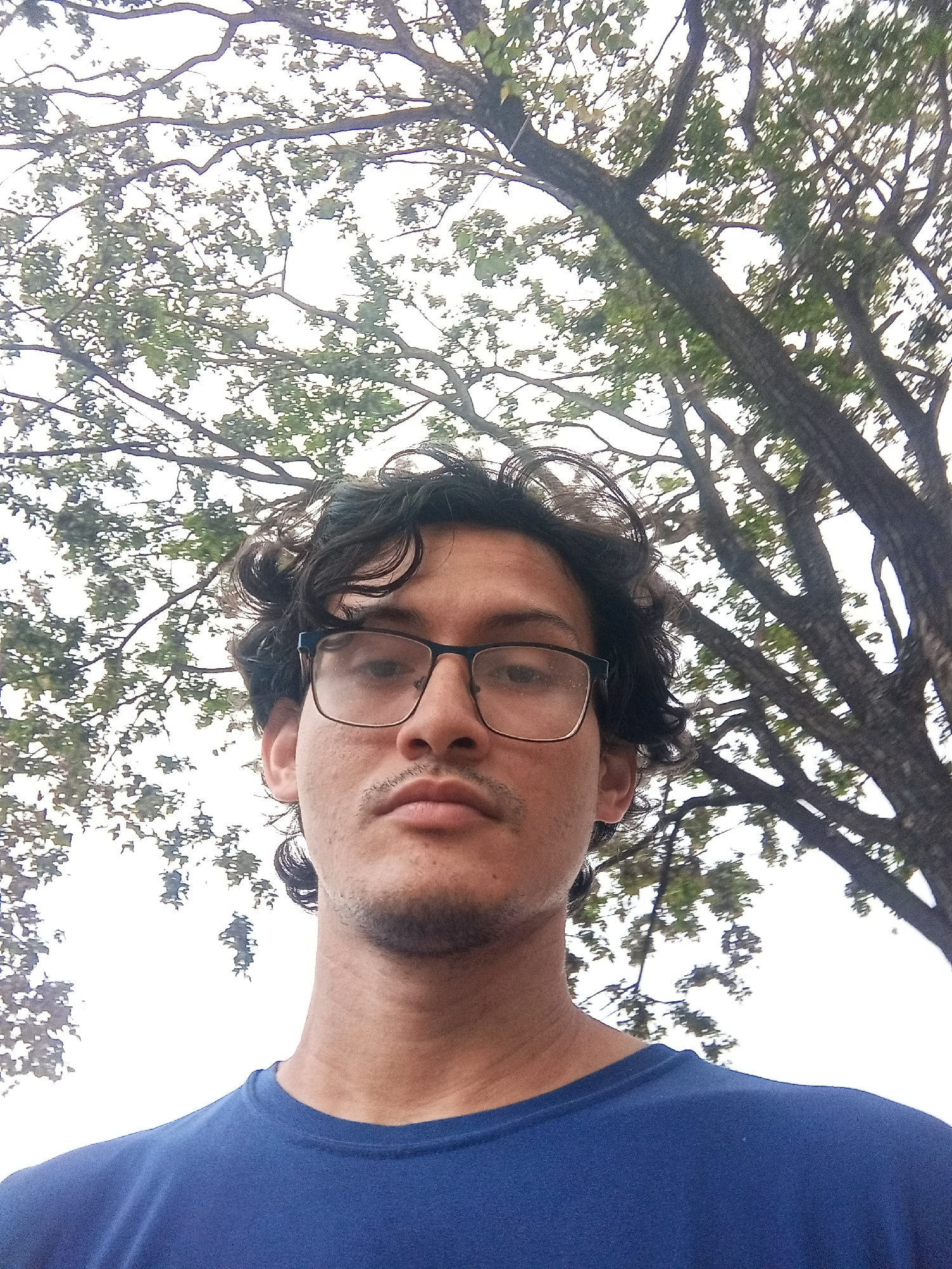 A medium shot of a man wearing glasses and a blue shirt, positioned from a low angle looking up into a tree with dense foliage. The background shows a clear sky visible through the branches. The scene…read more