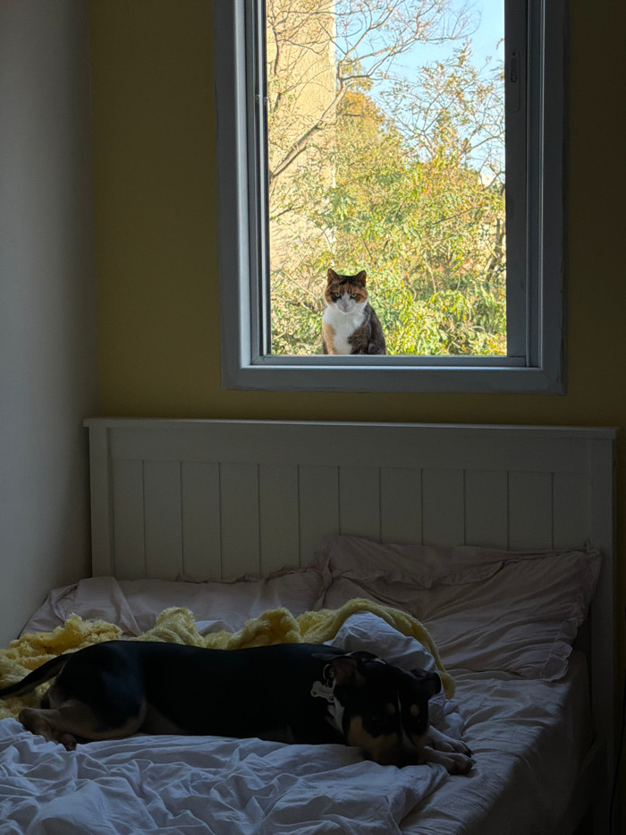The image captures an indoor scene in Tel-Aviv, Israel, looking out through a window. In the foreground, a dark-coated dog, appearing to be a medium-to-large breed with black and tan markings, lies on…read more