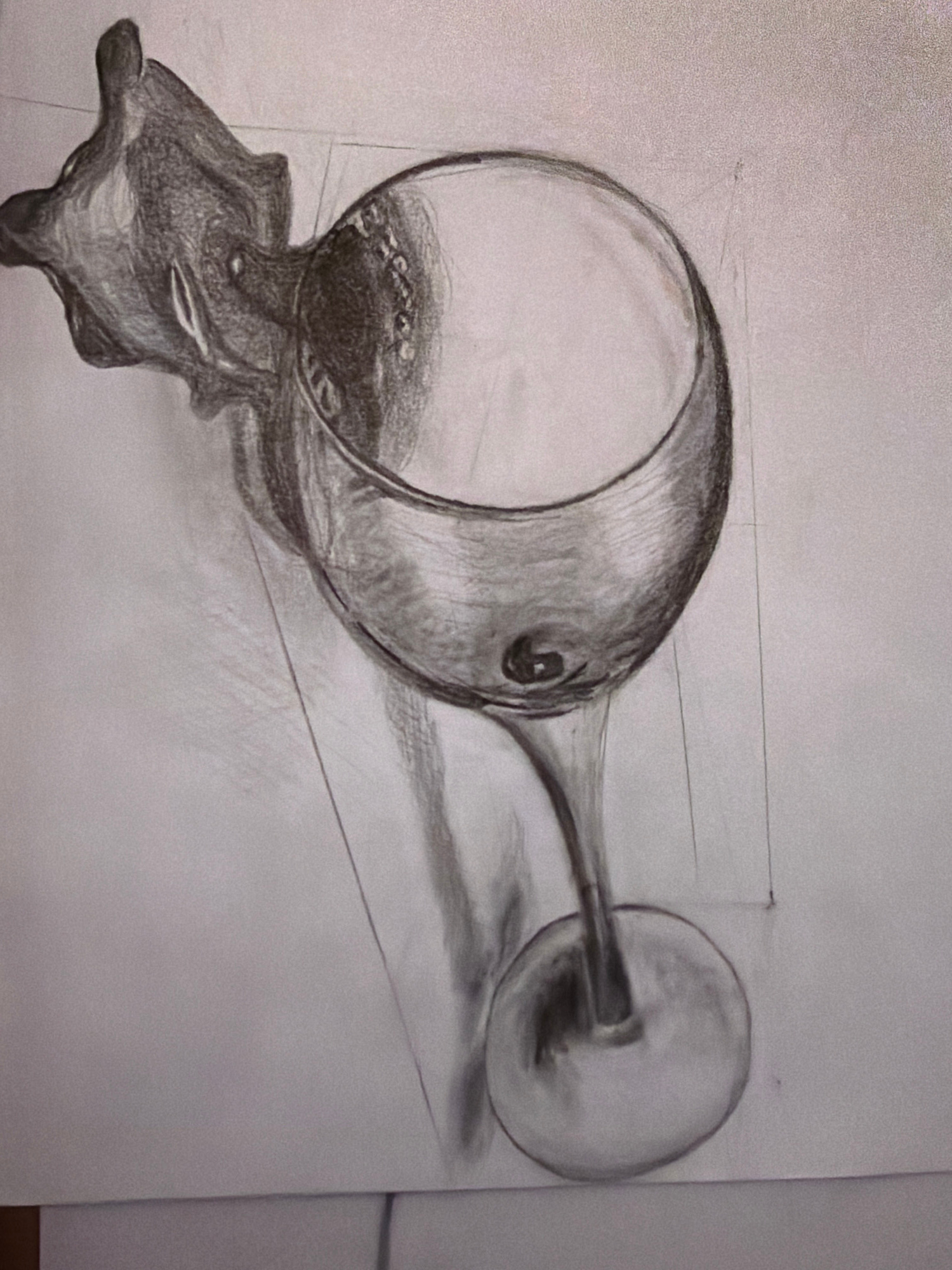 A still-life pencil drawing depicts a spilled wine glass. The glass is lying on its side with wine spilling out onto a surface. The environment surrounding the glass is a plain background, possibly a…read more