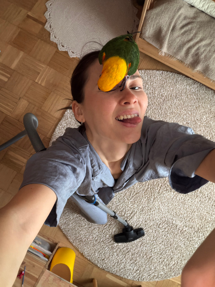 A person in a grey pajama set is angled for a selfie, sticking their tongue out with a yellow and green parrot perched on their nose. The background is a beige carpet, a vacuum cleaner, and wooden flo…read more