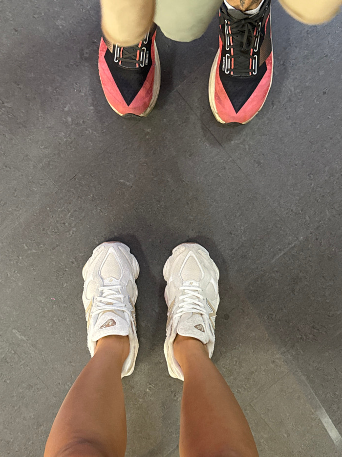 A top-down view captures the lower legs and footwear of two individuals standing on a dark gray, smooth floor. In the foreground, a person wears a pair of light-colored, off-white New Balance 2002R sn…read more