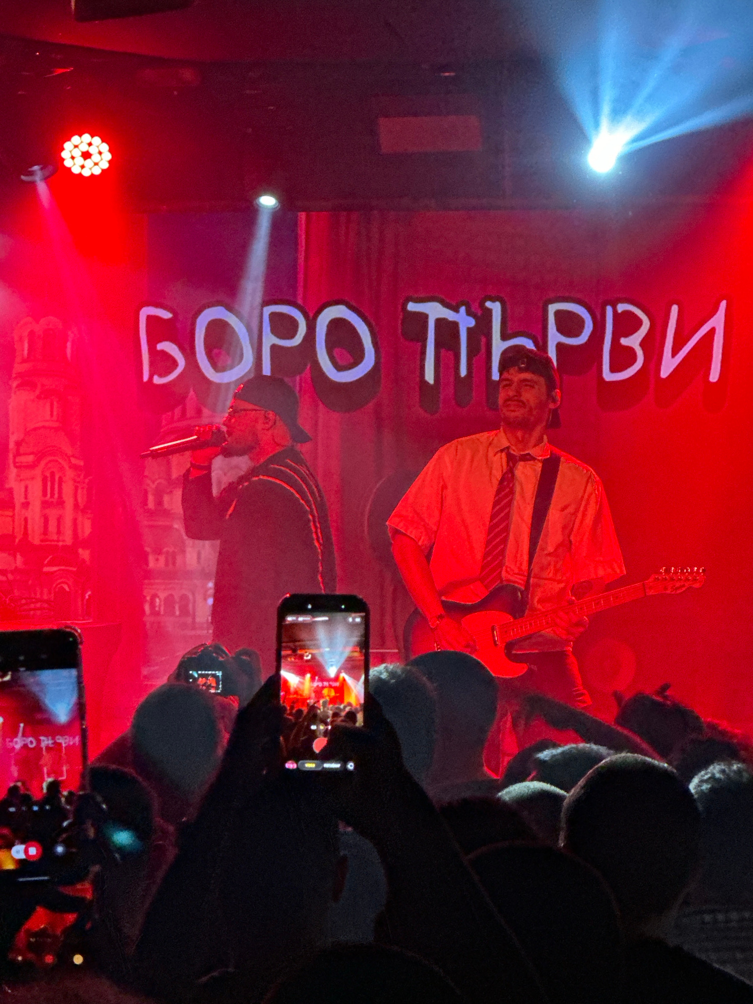 A concert stage at a venue in Sofia, Bulgaria. Two male performers are visible: one is playing a guitar and wearing a short-sleeved yellow shirt with a striped tie; the other, wearing a hat, is singin…read more