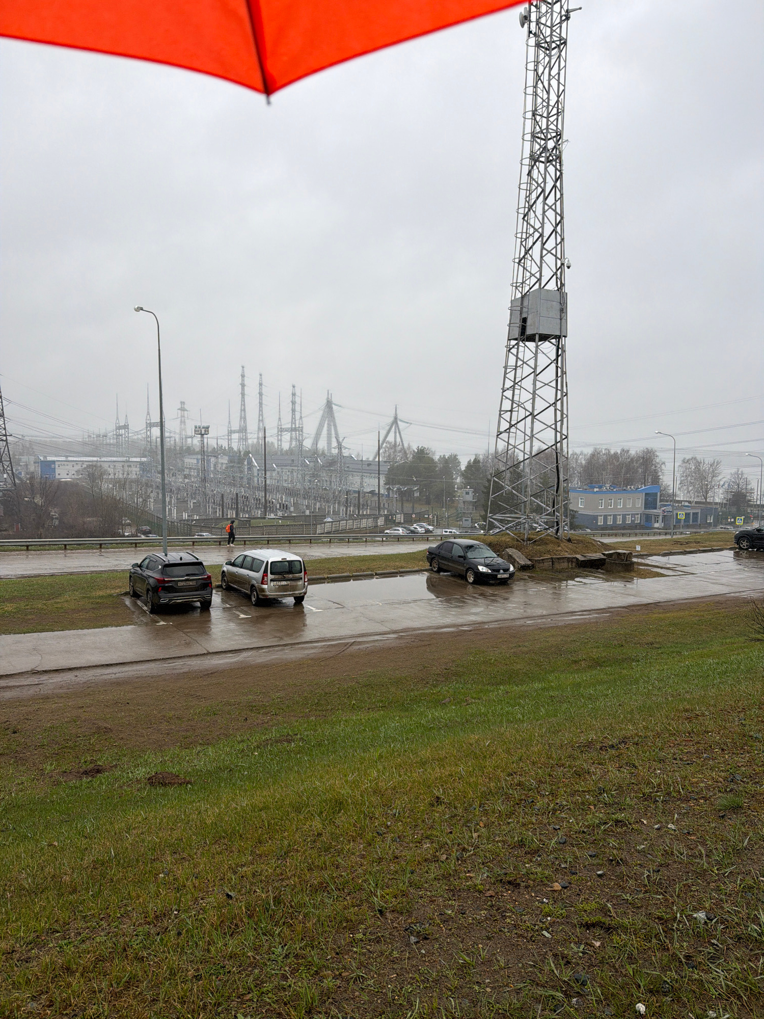 The image depicts an overcast and wet day in Chaikovsky, Russia, with a slightly tilted perspective. In the immediate foreground on the left, a vibrant orange umbrella or canopy is partially visible.…read more
