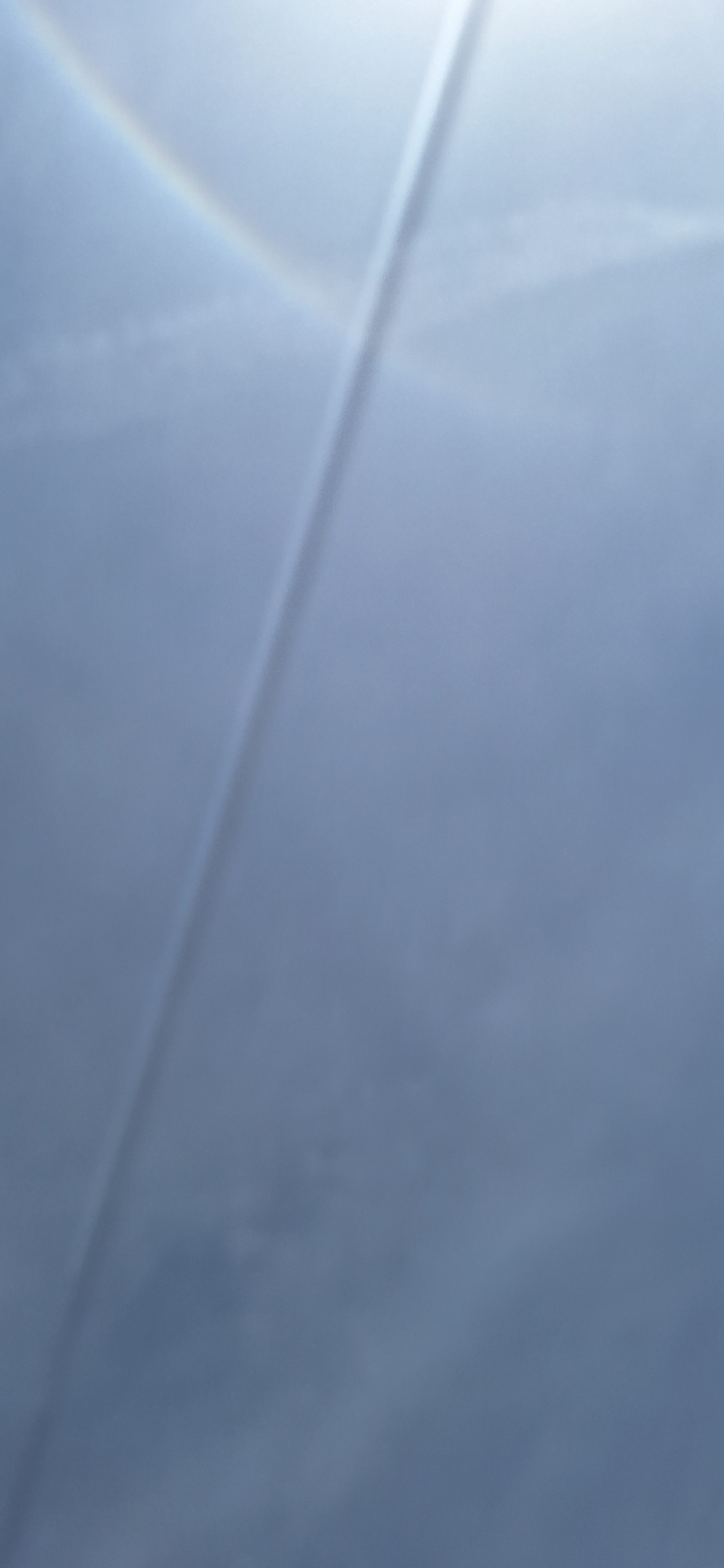The image shows a blurred view of a pale blue sky with a horizontal line bisecting the frame diagonally from the lower left to the upper right. A faint rainbow or prismatic effect appears in the lower…read more