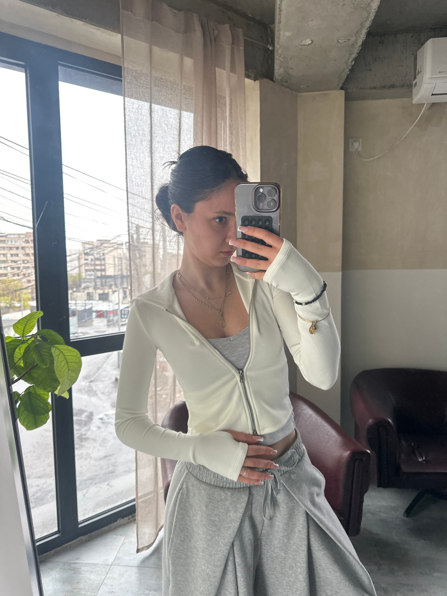 A woman is taking a mirror selfie indoors. She is wearing a white, long-sleeved zip-up jacket and grey sweatpants. Her hair is pulled back in a bun. She is holding a phone with a grey case in her righ…read more