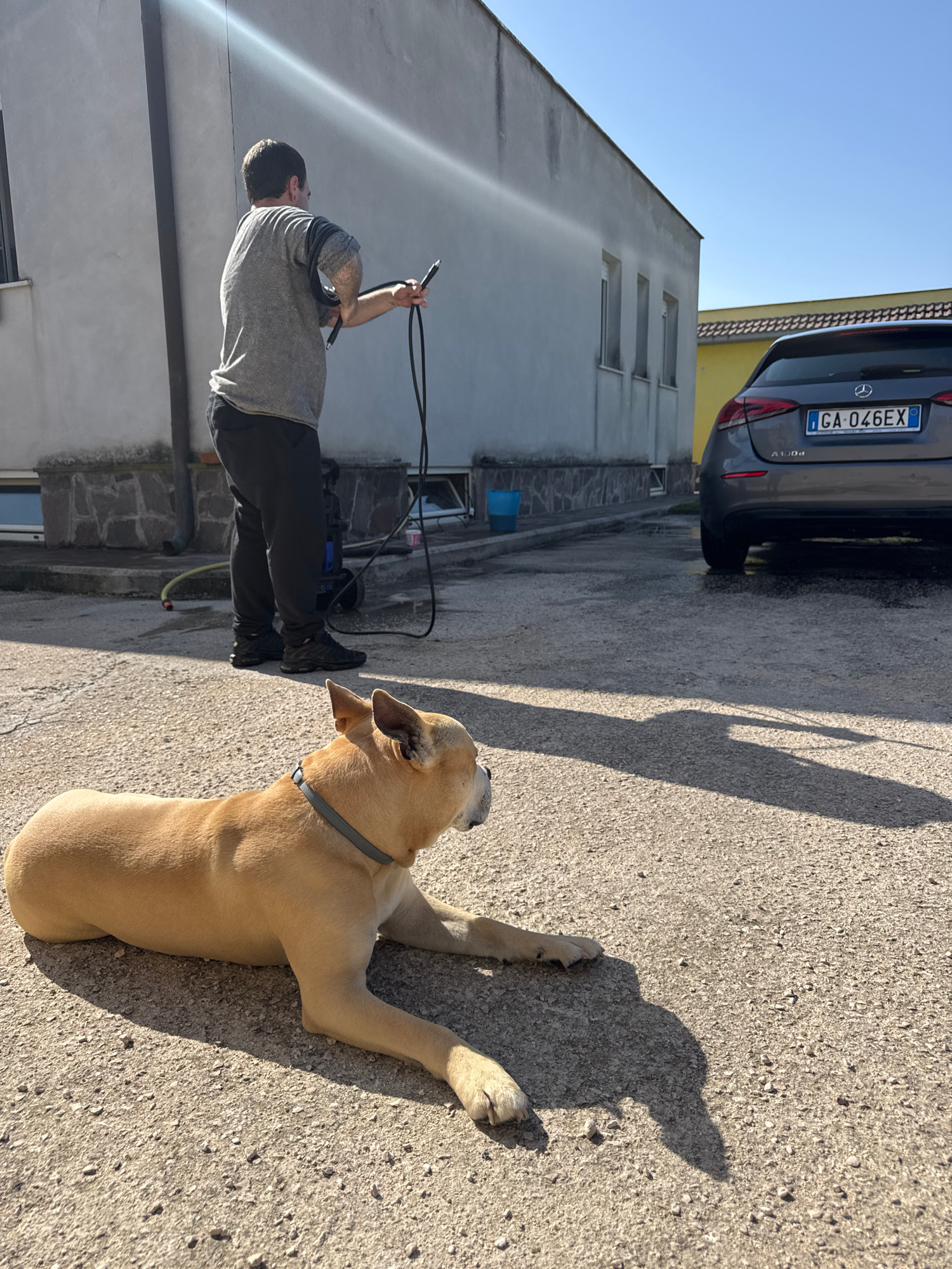 This image, taken in Aprilia, Italy, depicts an outdoor scene under bright sunlight. In the foreground, a large, light brown dog with a grey collar is lying calmly on an asphalt or concrete surface, l…read more