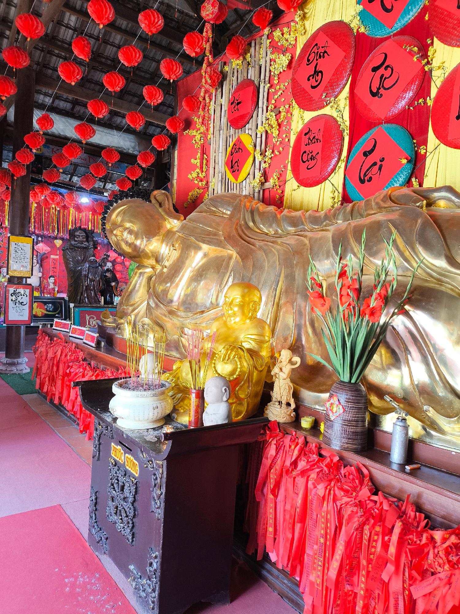 The image shows a golden reclining Buddha statue inside a temple, likely located in Lâm Viên - Đà Lạt, Vietnam. The statue is lying on a platform adorned with red ribbons. In front of the statue, ther…read more