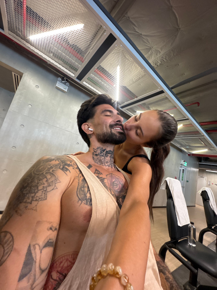The image captures two individuals in an intimate embrace within a modern, industrial-style interior, identified as a facility in Bangkok, Thailand. A male subject, positioned in the foreground and ap…read more