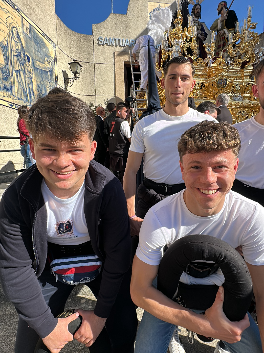 The image captures three young men posing for a photo in front of the "Santuario de San Lucas" in Jerez de la Frontera, Spain. In the background is the sanctuary itself, featuring a blue-tiled mural a…read more
