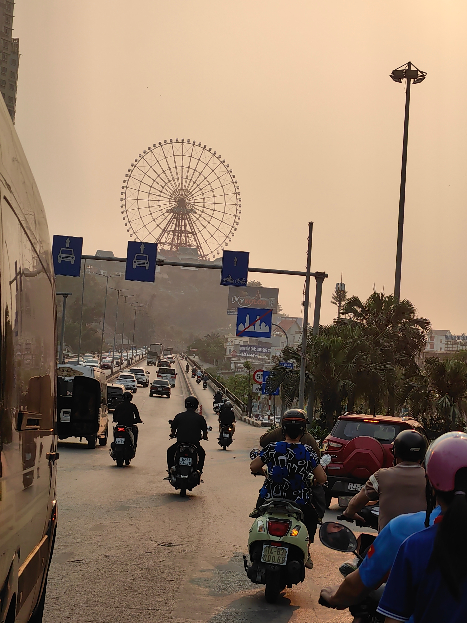 The image captures a busy street scene in Hong Gai Ward, Vietnam. Heavy traffic consisting of cars, motorbikes, and vans is visible, creating a congested atmosphere. Several individuals on motorbikes…read more