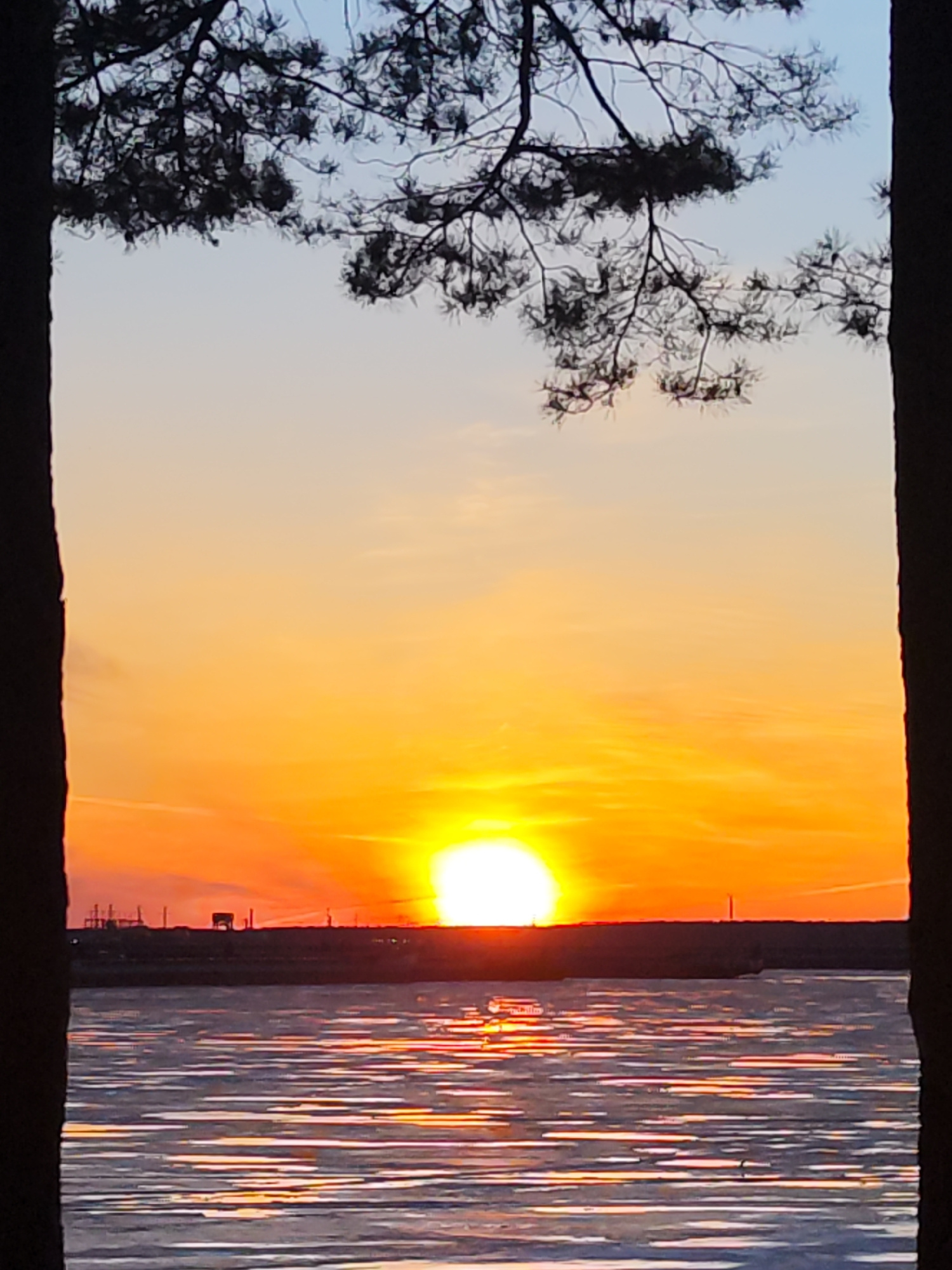 The image depicts a sunset over a body of water. The sun is low on the horizon, emitting a bright, intense light, with the sky transitioning from orange near the horizon to a lighter blue higher up. T…read more