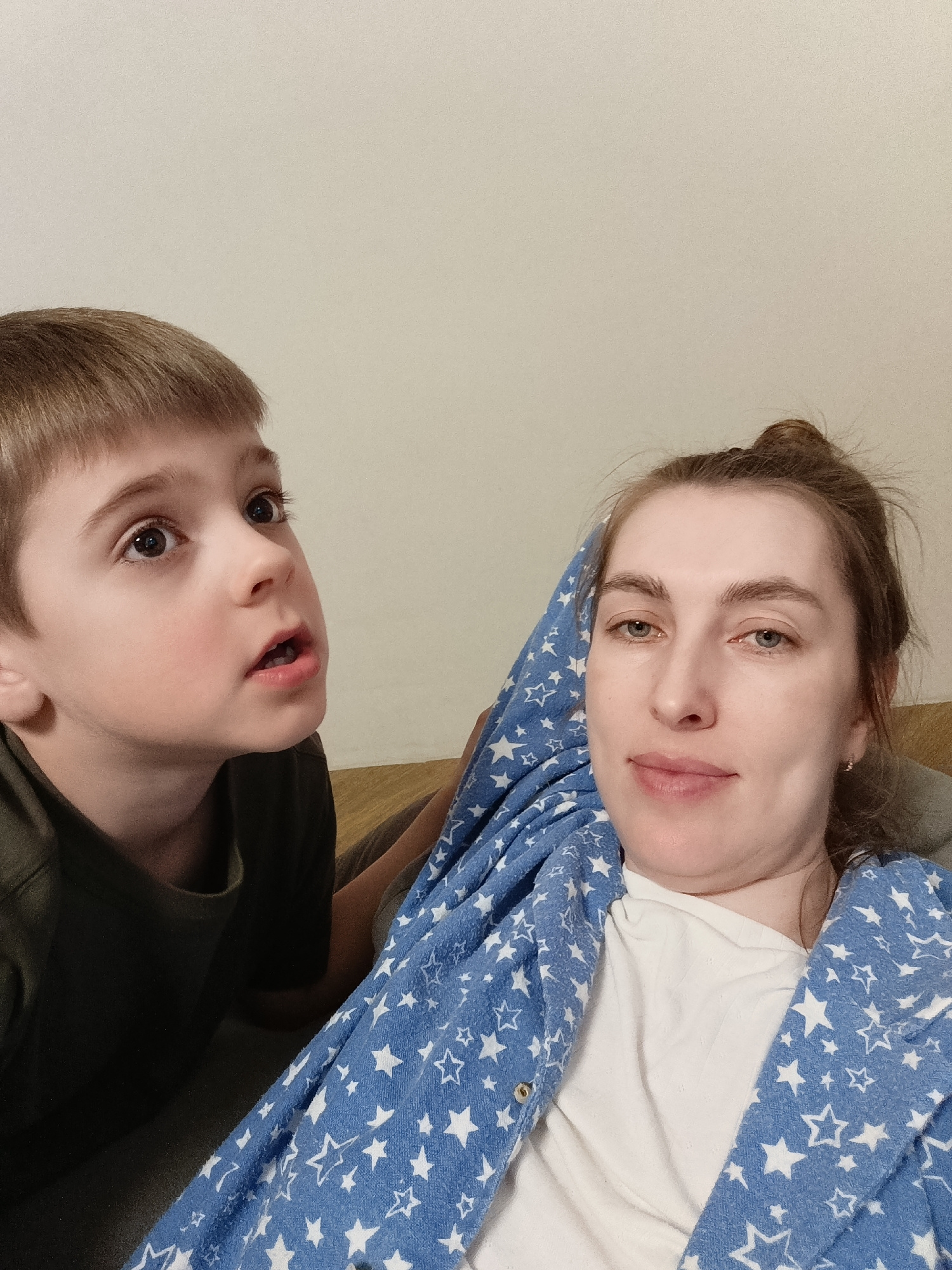 A woman and a young boy are in what appears to be an indoor setting. The woman is wearing a white shirt and a blue robe with white stars. Her hair is up in a bun. The boy is next to her and wearing a…read more