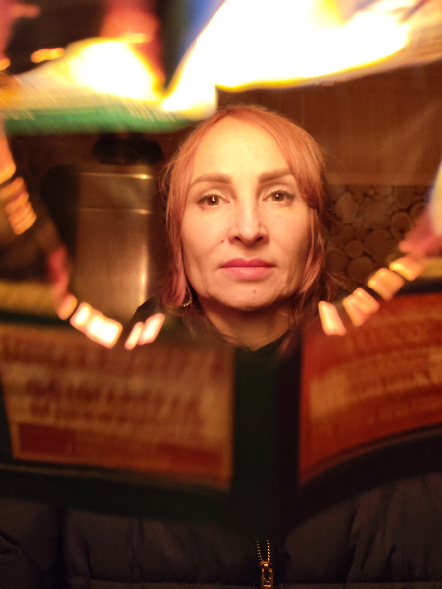A woman with fair skin and reddish-blonde hair looks directly at the camera. She has light eyes, prominent cheekbones, and is wearing lipstick. She is framed by an out-of-focus, angular shape of orang…read more