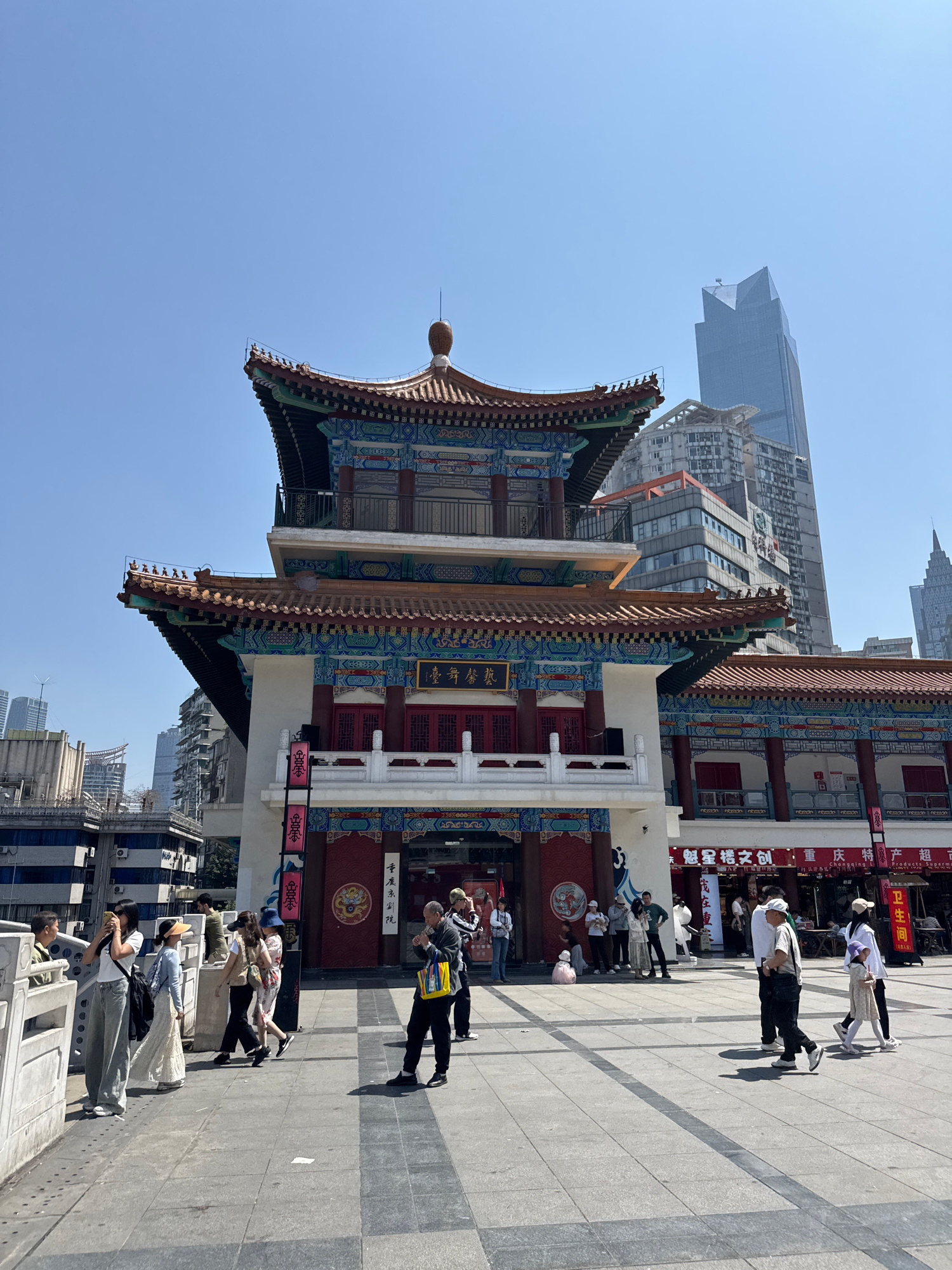 The image captures a traditional Chinese structure against a backdrop of modern buildings in the city of Yuzhong District, China. The structure is a multi-tiered building with a red and blue ornate ro…read more