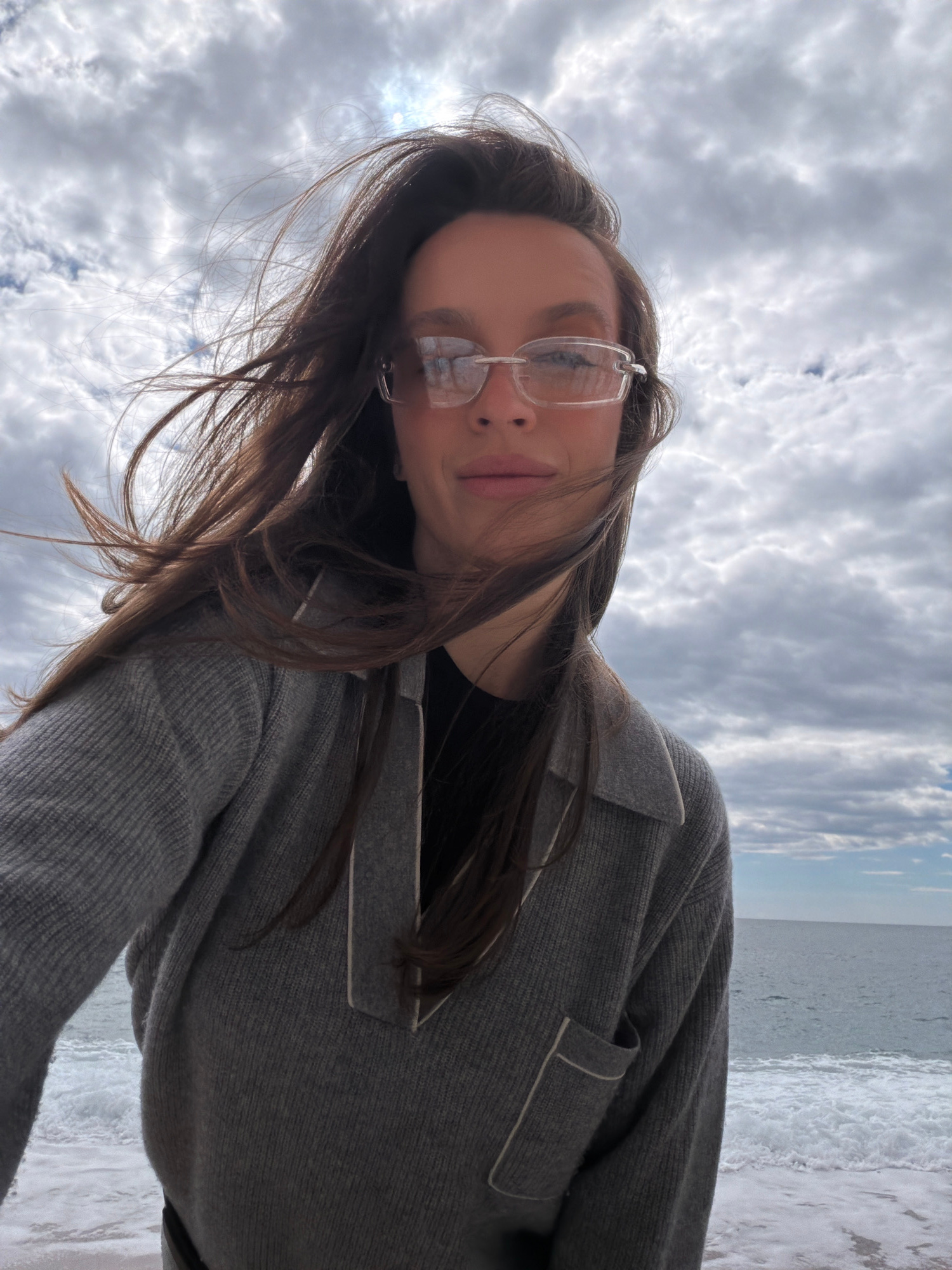 A woman with long brown hair and glasses is taking a selfie outdoors. The background is a cloudy sky, and the edge of a beach with ocean waves is visible. The woman is wearing a grey sweater. The loca…read more