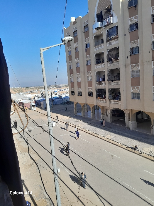 A sideways view of a sunlit urban landscape shows a tall building with multiple floors, balconies, and arched openings alongside a wide road. Several people are walking on the road and along the edge…read more
