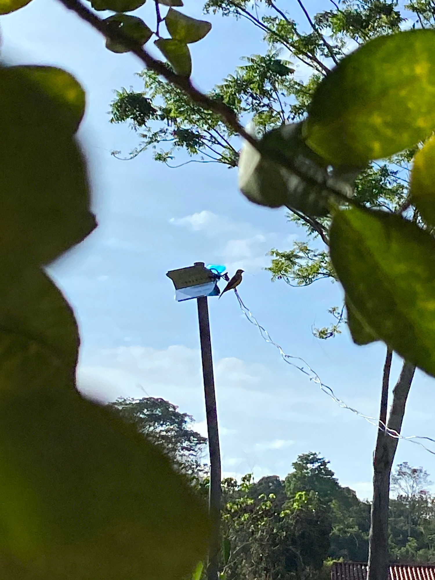 The image shows a bird perched on a light fixture mounted on a pole. The scene is partially obscured by foliage in the foreground. In the background, trees and a section of a building are visible agai…read more