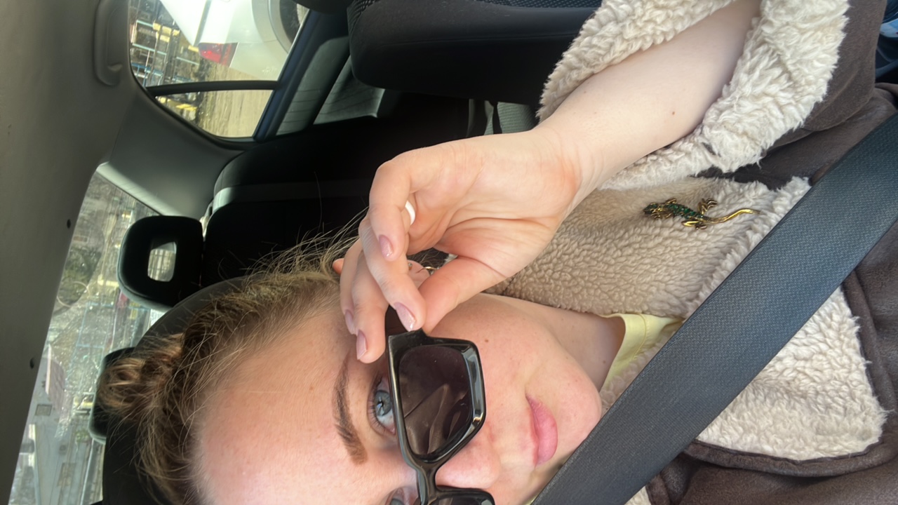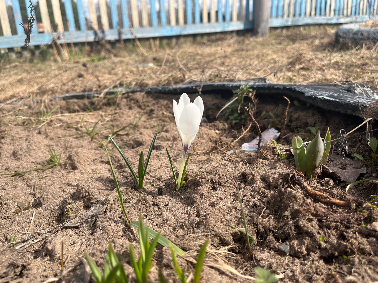A low-angle, daytime shot focuses on a single white crocus flower in bloom, surrounded by green shoots emerging from sandy soil. A dark tire partially frames the right side of the composition. In the…read more