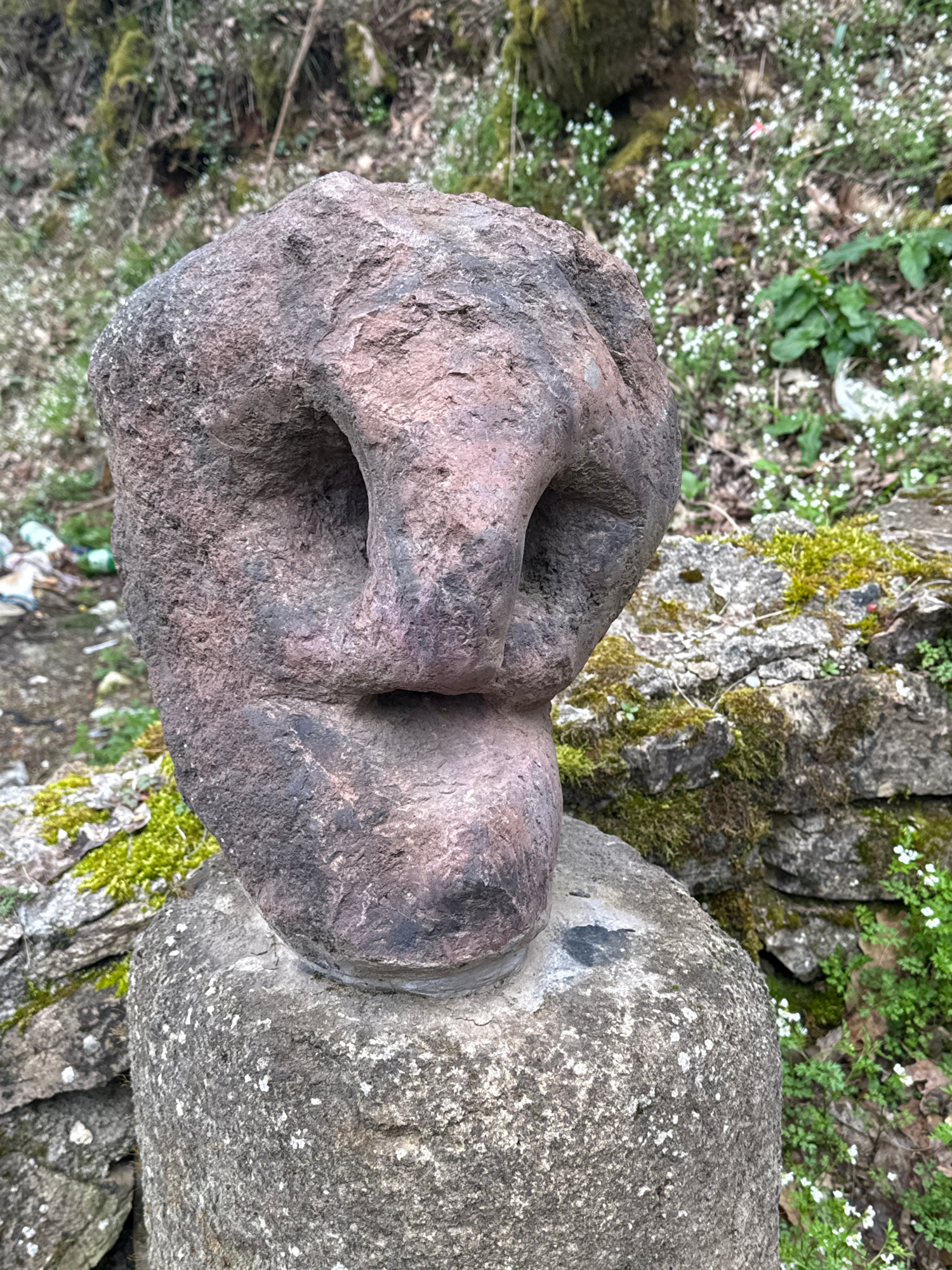 A stone head statue, likely part of a larger monument, sits outdoors near moss-covered rocks and vegetation, including small white flowers, in Konche, Bulgaria. The statue is composed of two distinct…read more