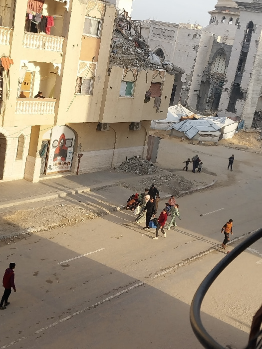 The image depicts a damaged urban street scene in Khan Yunis, Palestinian Territory, under daylight conditions with prominent shadows indicating low sun angle. On the left, a multi-story building exhi…read more