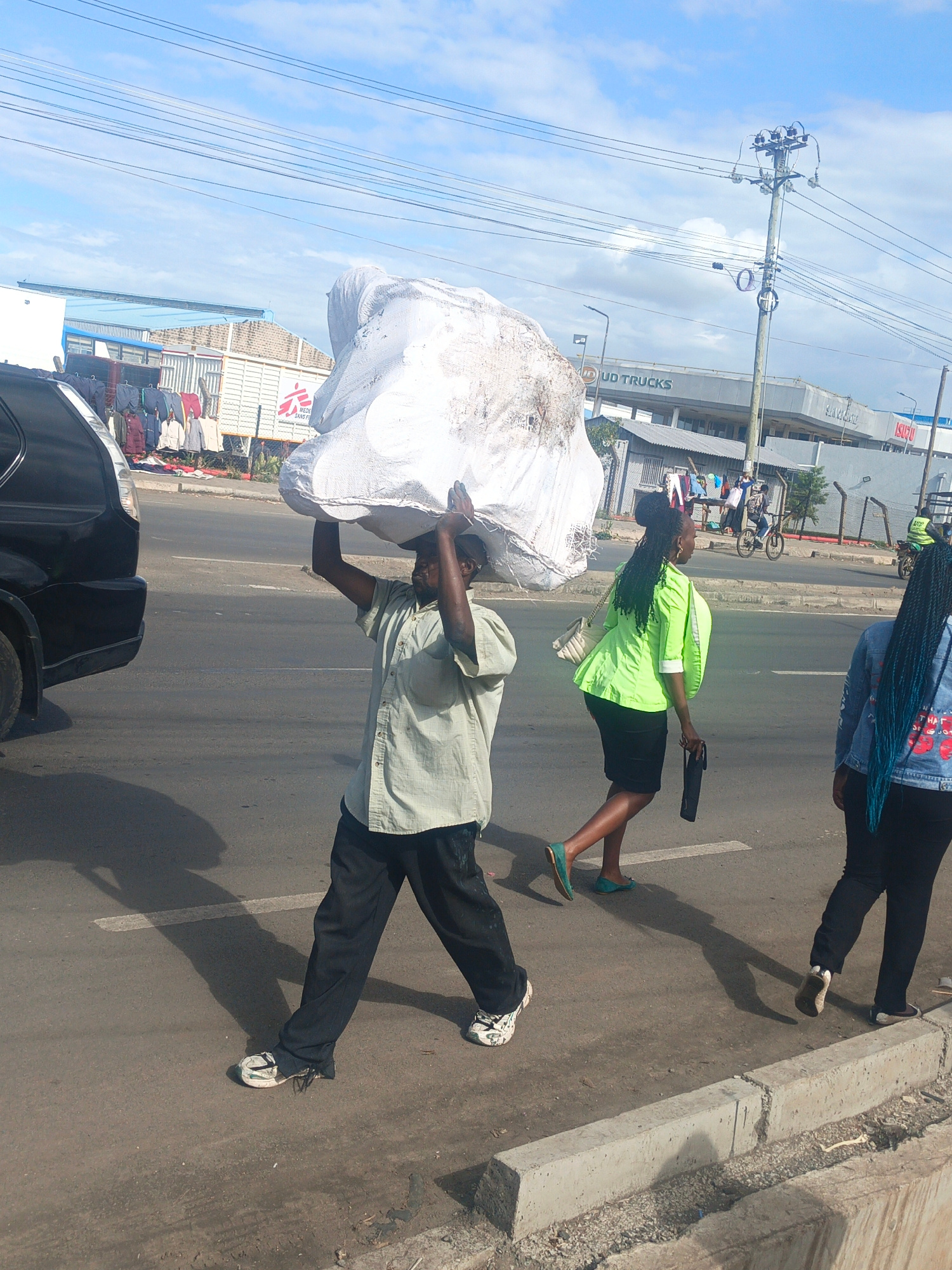 A man is carrying a large white bundle on his head while walking on a street in Nairobi, Kenya. He is wearing a light-colored button-down shirt and dark trousers, with worn sneakers. Two women are wal…read more