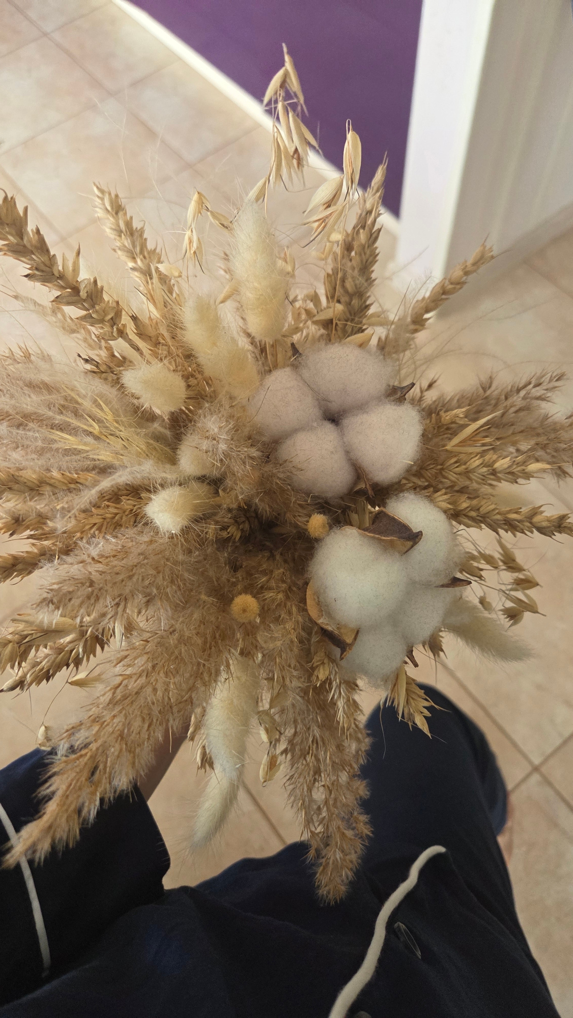A bouquet of dried flowers, including wheat, bunny tails and cotton, is held in someone's hand. The person is wearing a navy blue top with a white stripe. The background includes a light-colored tiledβ¦read more