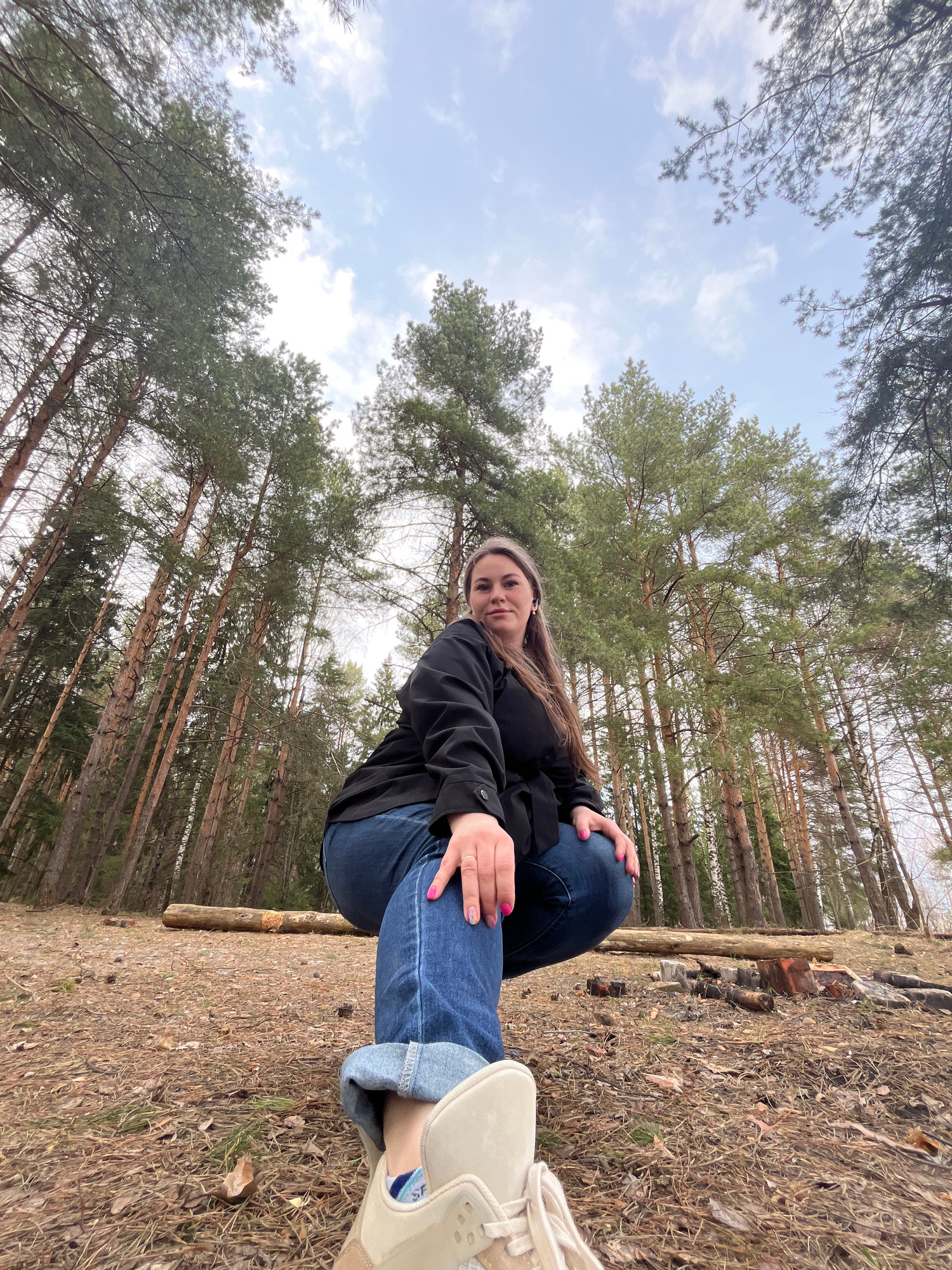 The image shows a woman sitting on a log in a forest. She is wearing a black jacket and blue jeans, with a headband in her hair. Pine trees are visible in the background. The location is inferred to b…read more