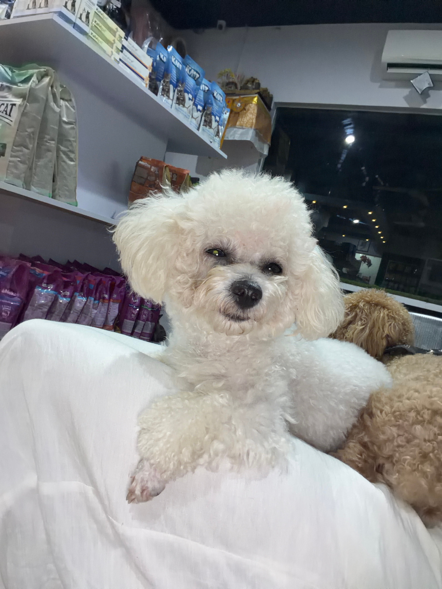 A white Bichon Frise dog lies on a white surface, potentially a bed or examination table. Another brown, curly-haired dog partially appears in the frame. The setting seems to be inside a shop, evidenc…read more