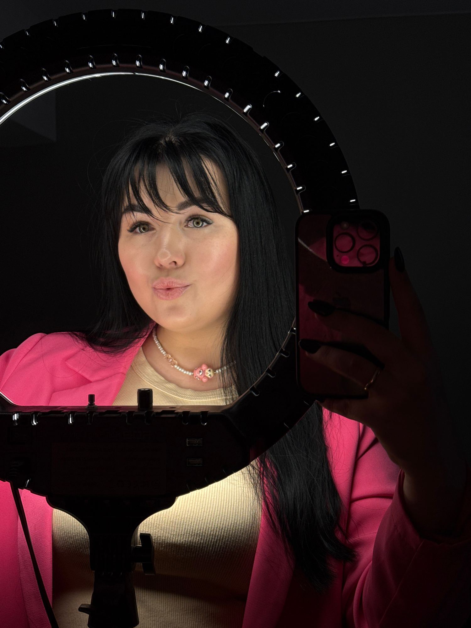 A woman with black hair and bangs, wearing a pink blazer, is holding a smartphone in front of a ring light. The phone has a pink case and multiple camera lenses. She is also wearing a necklace with pi…read more
