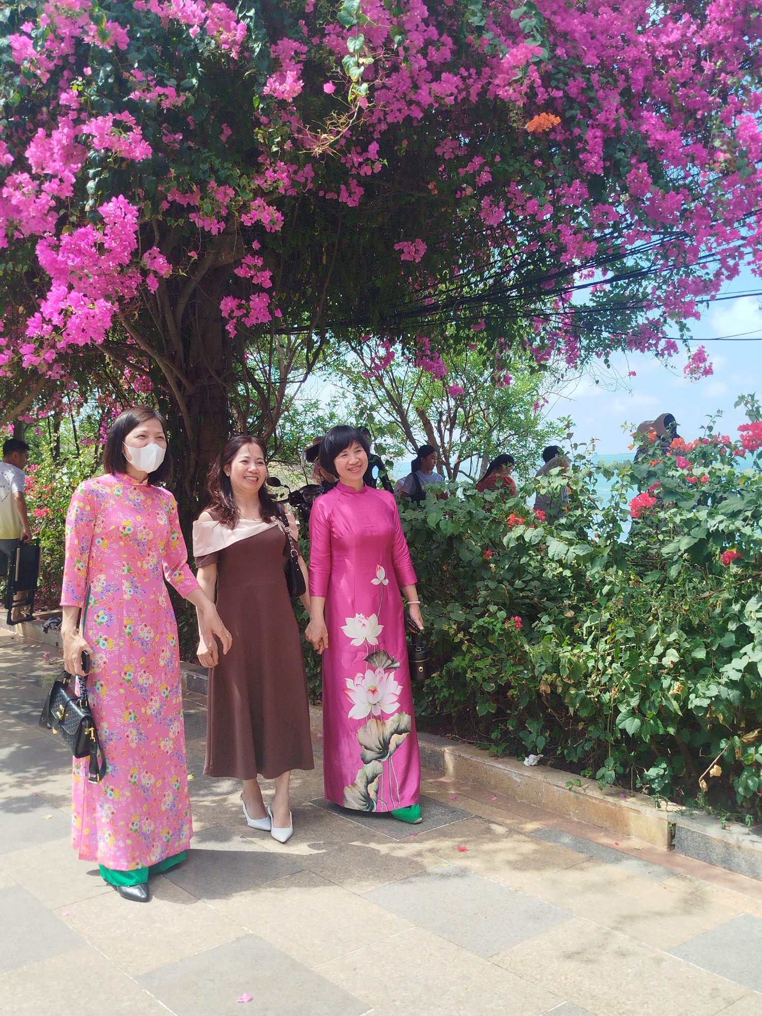 Three women are walking together along a sidewalk near a body of water, likely the ocean, in what appears to be a public park or garden. The woman on the left is wearing a pink floral patterned dress…read more