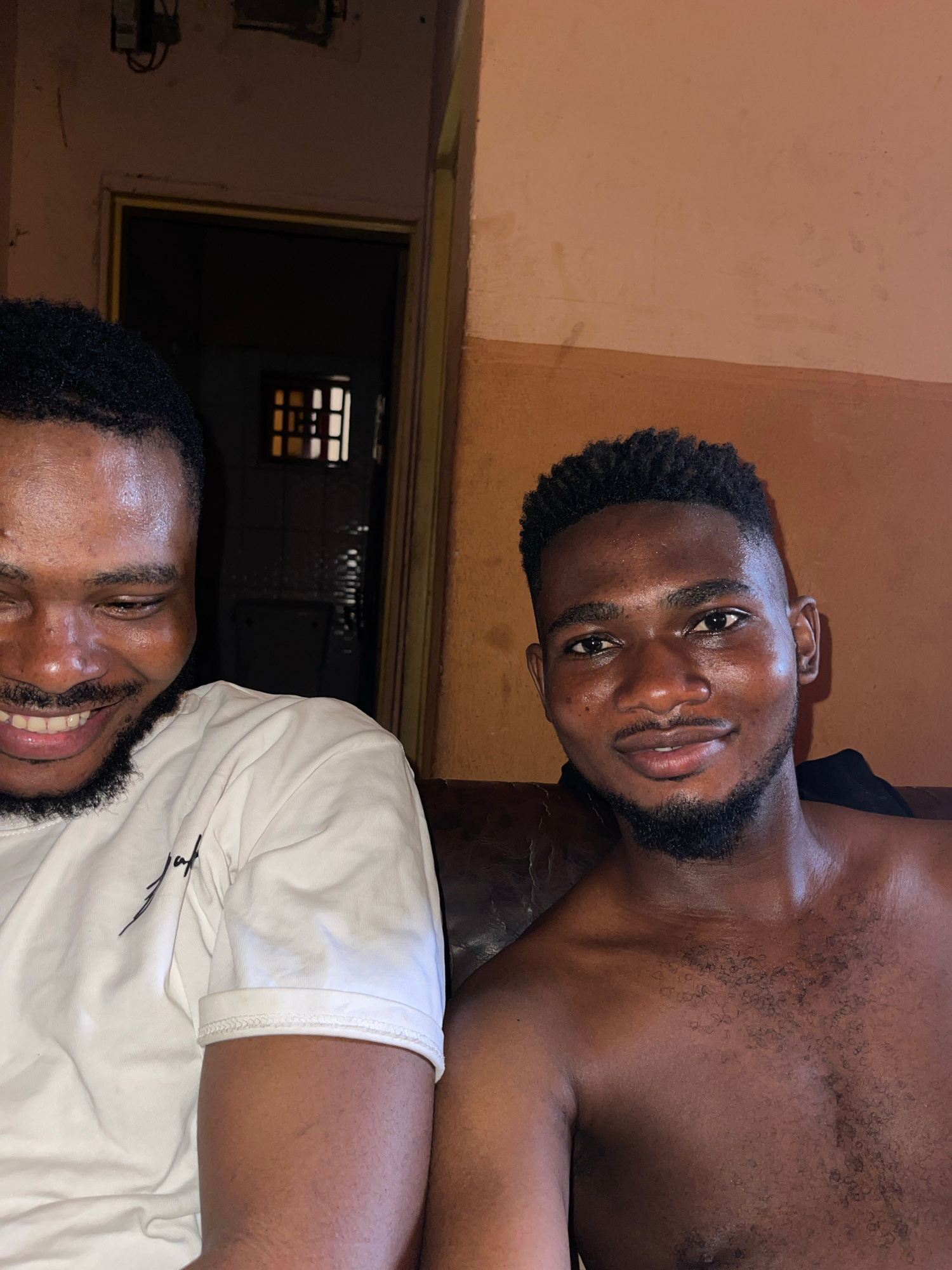 Two men are lying next to each other indoors. One man is shirtless with dark skin, a beard, and short curly hair. He is looking towards the viewer with a slight smile. The other man is wearing a white…read more
