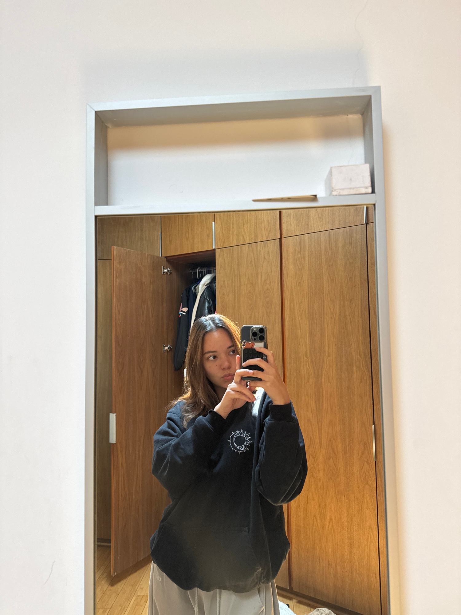 A woman is reflected in a framed mirror. She is holding a smartphone and taking a selfie. The mirror is mounted on a wall and reflects a wooden cabinet or wardrobe. The environment appears to be indoo…read more