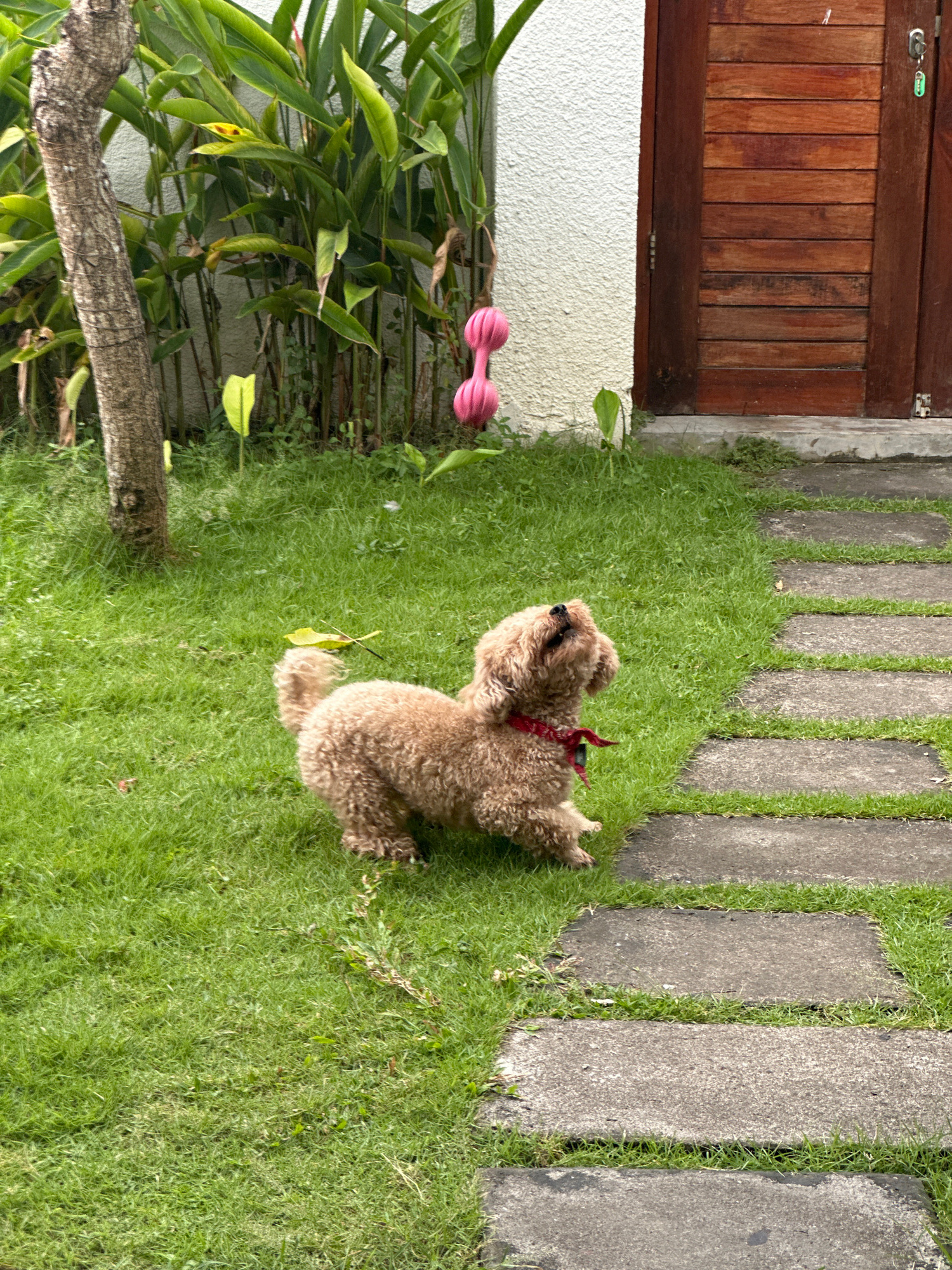 The image depicts a brown poodle wearing a red harness, sitting on a lawn with a mix of grass and weeds. Behind the dog, there's a path constructed with rectangular concrete slabs. To the left, a tree…read more