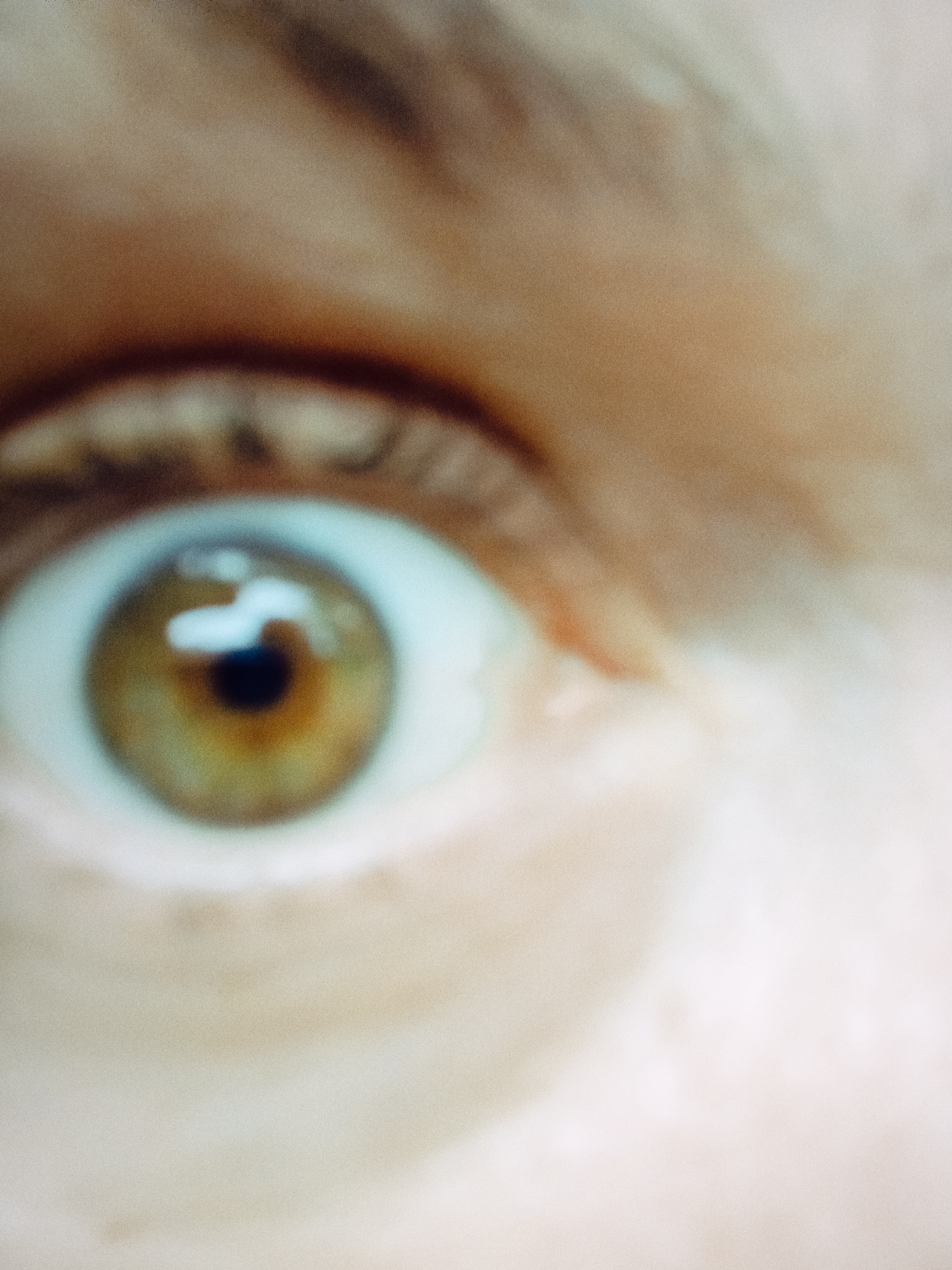 A close-up, blurred image of a human eye with a light brown iris. The surrounding skin and eyebrow are also visible, though out of focus. The location and city are not discernible from this image.