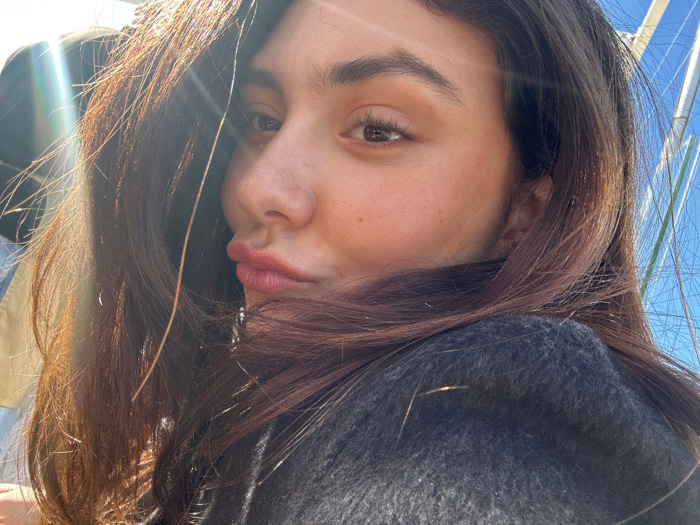 A close-up, sunlit portrait depicts a young adult female looking directly at the viewer. Her long, dark brown hair, illuminated by prominent lens flares and sunbeams originating from the upper left, fâŚread more